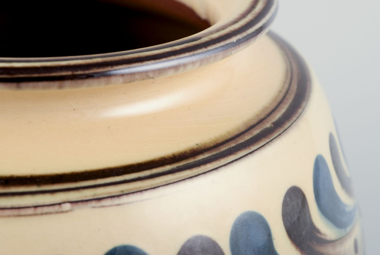 Glaze in blue and brown tones on a cream coloured base.