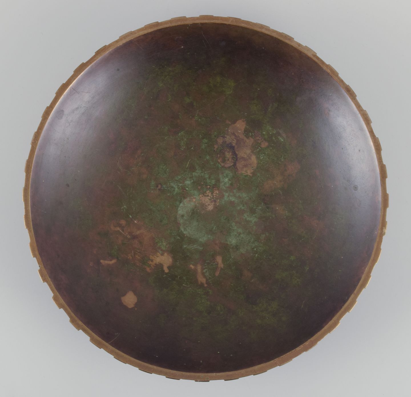 Tinos, Danmark Stor skål i massiv bronze. Art Deco. Tung skål af høj kvalitet. Rillet design. Smuk patina. Datering: 1948. Stemplet med inskription i bunden I perfekt stand. Mål: D 29,0 cm. x H 5,0 cm.