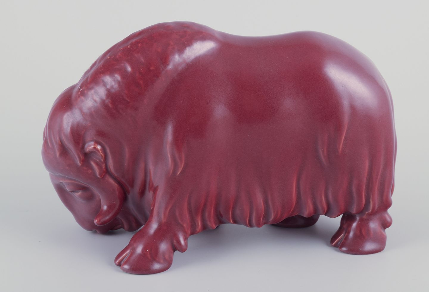 Svend Lindhart (1898-1989), eget værksted. Dansk keramiker. Moskusokse i keramik. Okseblods glasur. Datering: Ca. 1960. Stand: Perfekt stand. Stemplet. Mål: L 22,0 cm. x B 9,0 cm. x H 14,0 cm.