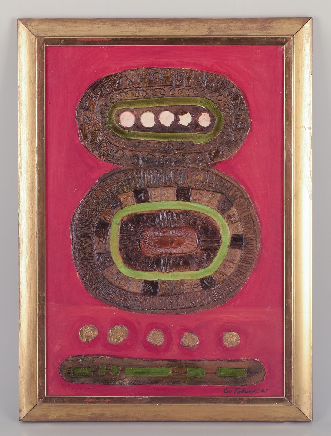 Leopold Falkowski (1913-1994). Polsk kunstner. Olie på plade. Abstrakt komposition. Signeret samt dateret ´67 (1967). Perfekt stand. Mål: 28,5 cm. x 42,5 cm. Totalmål: 35,5 cm. x 49,0 cm.