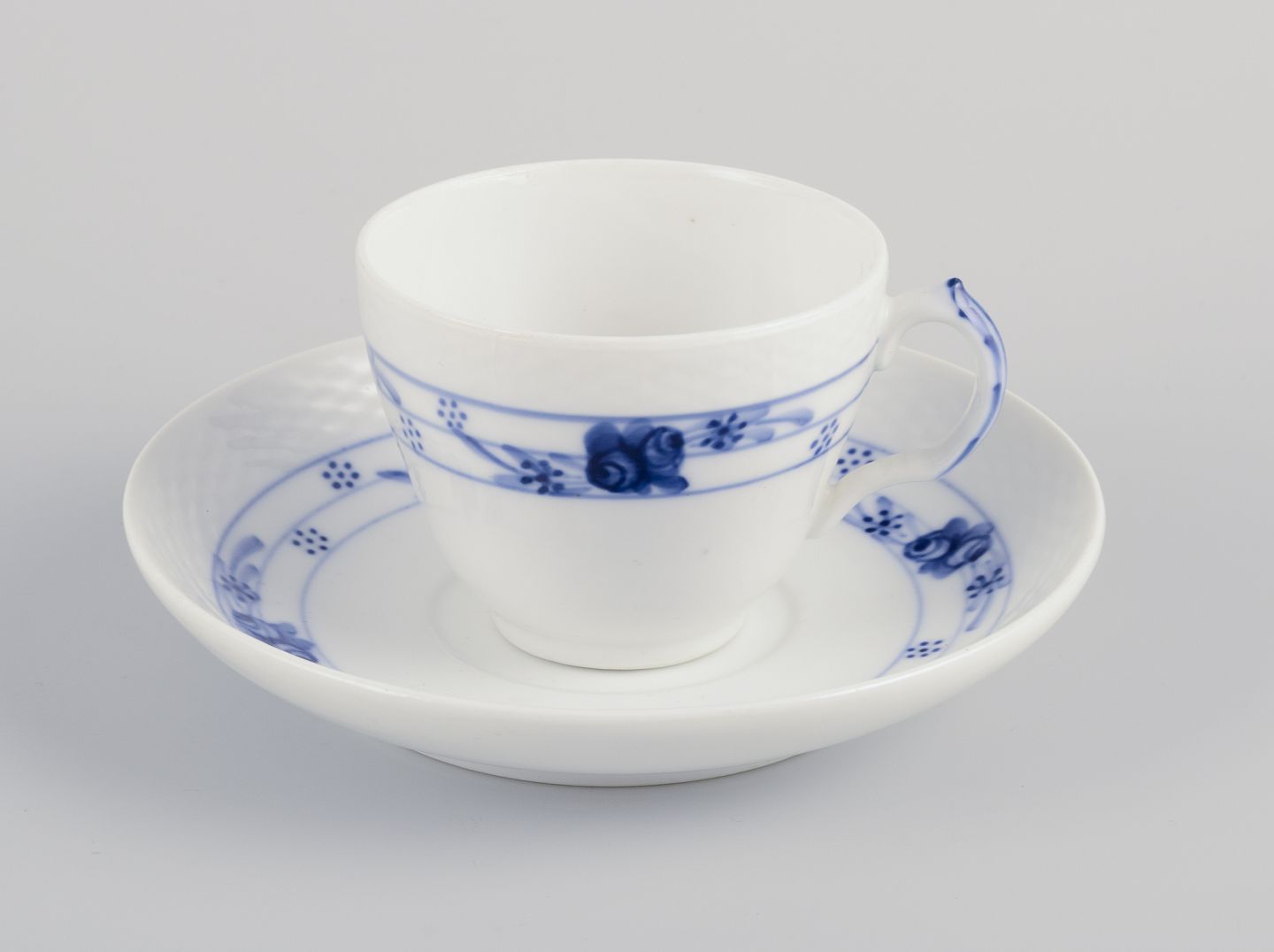 Tidligt Royal Copenhagen Rosenknop / Blå Rose kaffeservice til tre personer i håndmalet porcelæn.