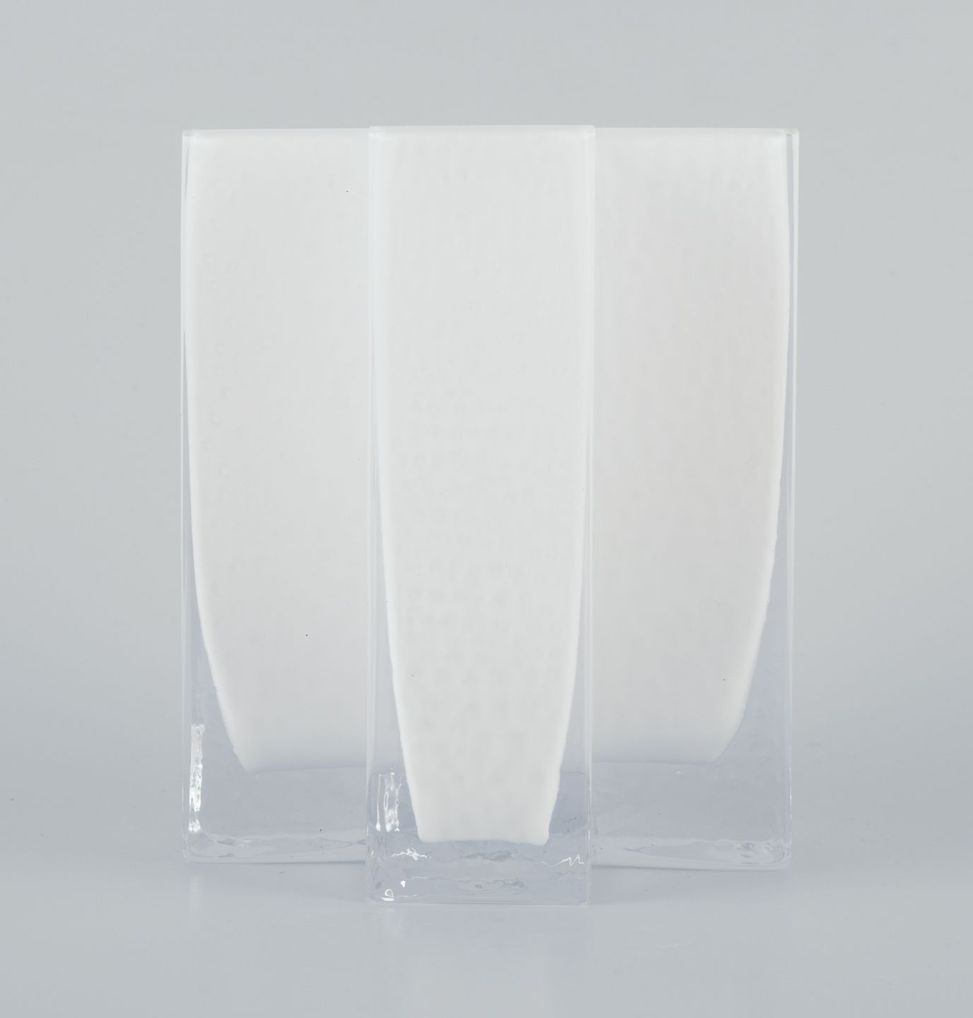 Bodil Kjær for Gullaskruf, Sverige. "Kryds" vase i hvidt og klart kunstglas.
