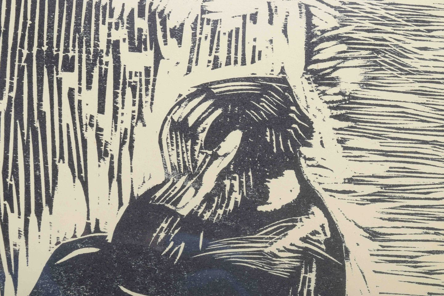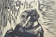 Et stærkt ekspressivt træsnit af Olivia Holm-Møller, hvor den knælende figur skildres med dramatisk enkelhed og dyb menneskelig resonans. Kompositionen bærer præg af kunstnerens karakteristiske brug af kontraster og monumentale former, hvor åndelighed og eksistens mødes i billedsproget.