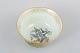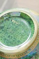 Skål i ”Lustre Ware” med grøn glasur, dekoreret med guldbemalet dragemotiv på ydersiden og fabeldyr i bunden. Indersiden med perlemorsskær og dekorativ bort langs kanten.