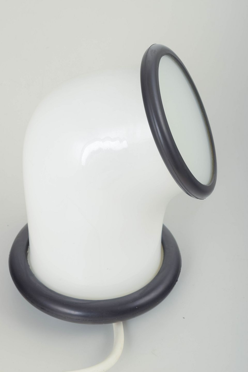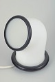 Bordlampe af opalhvidt glas med sorte detaljer, formet i et organisk, næsten skulpturelt udtryk. Lampen har en rund fod med sort ring og et let skråtstillet lysfelt, indrammet af sort kant. Ledning ca. 200 cm.