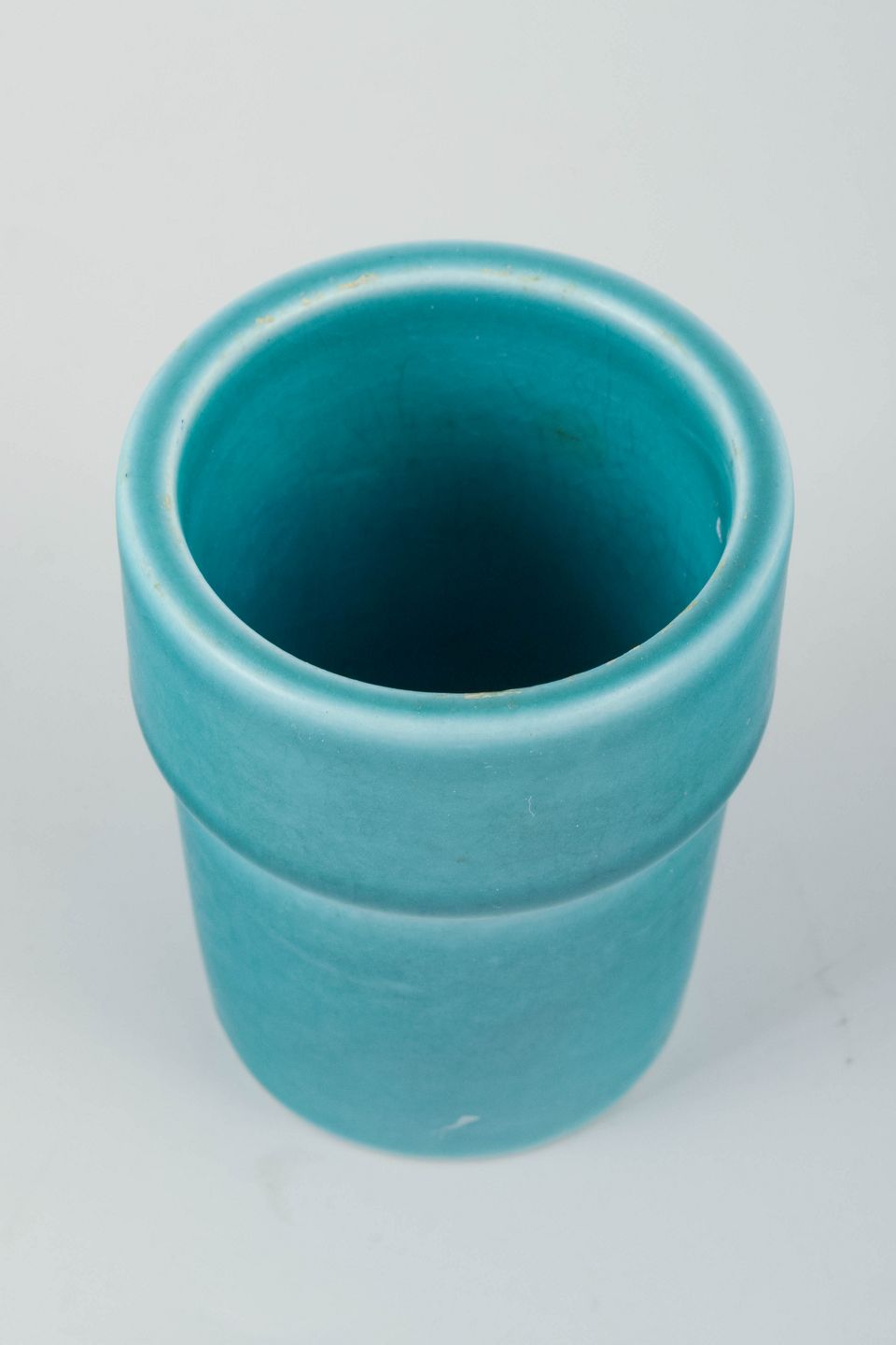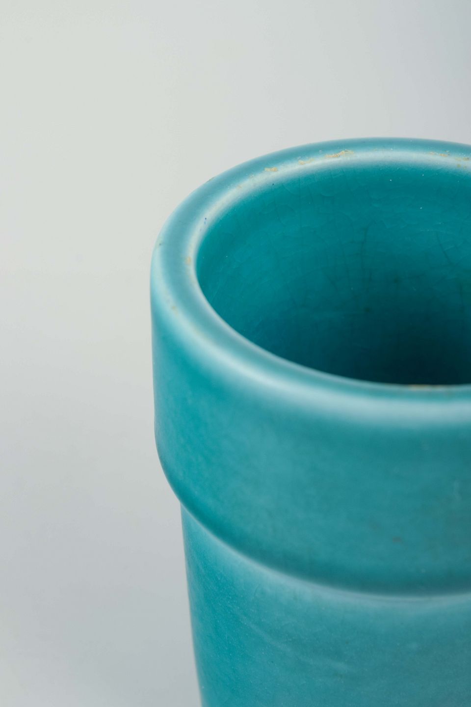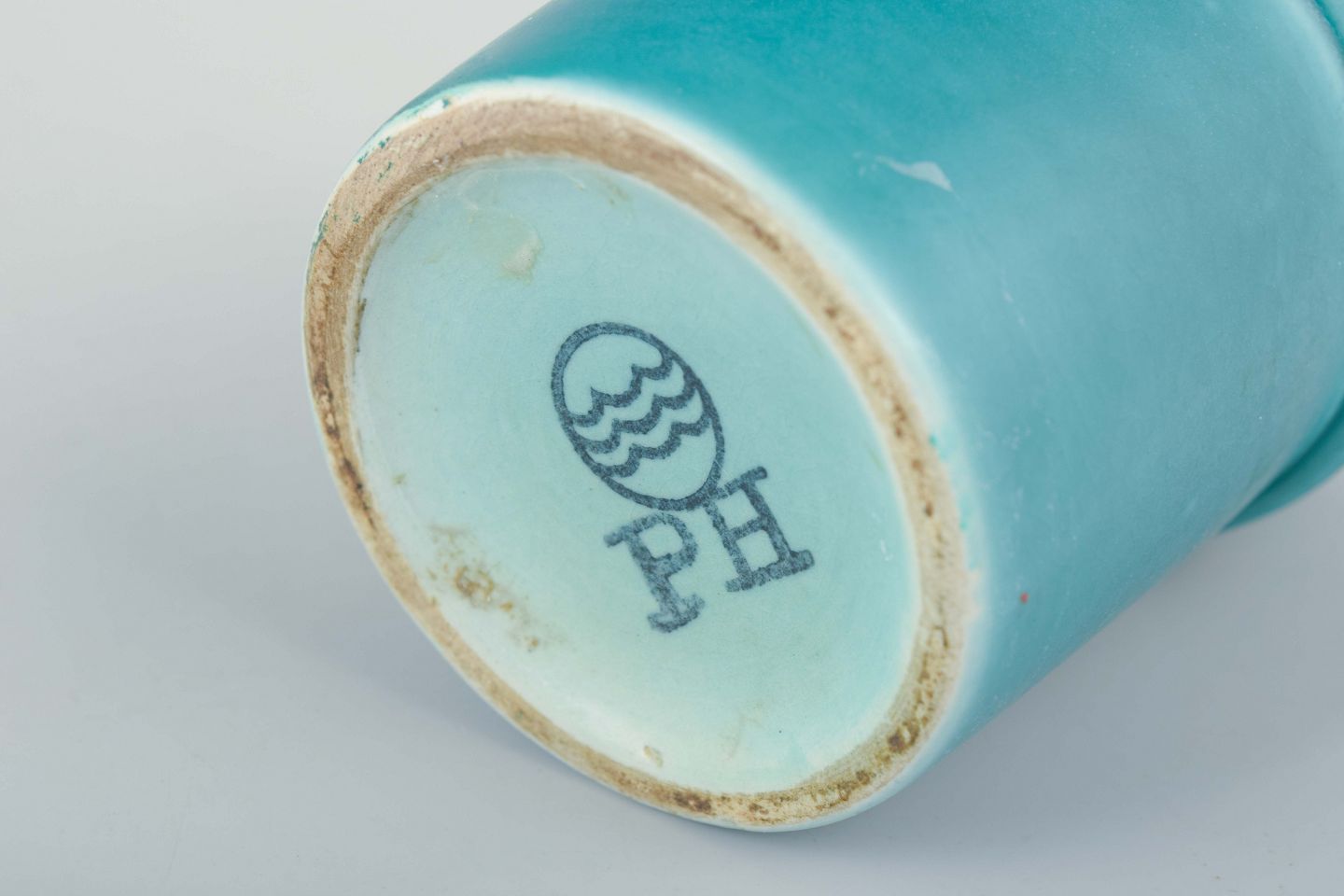 Cylindrisk vase med markeret midterprofil, dækket af ensfarvet turkisblå glasur. Stemplet under bunden med PH-monogram og Royal Copenhagens bølgemærke.