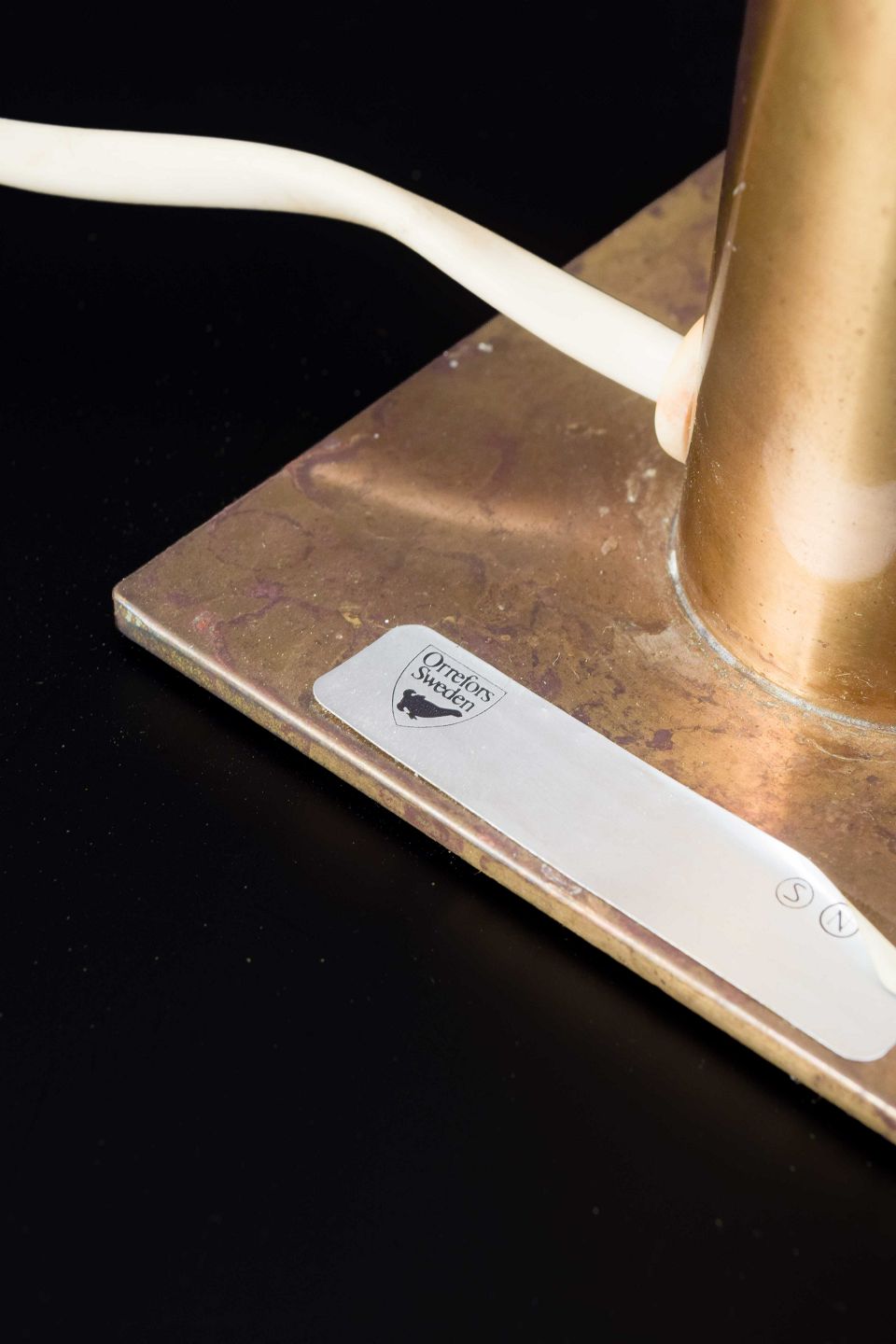 Mærket med originalt fabriksmærkat i metal med sort tryk “Orrefors Sweden”.
