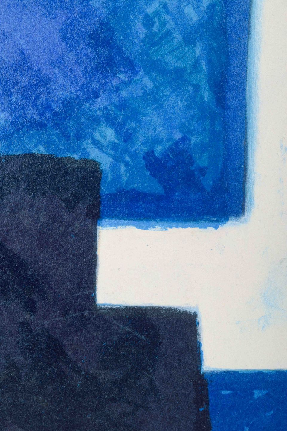 Et ekspressivt litografi af Osmund Hansen med geometriske former i blå og mørke nuancer, trykt på kraftigt papir. Værket er usigneret.