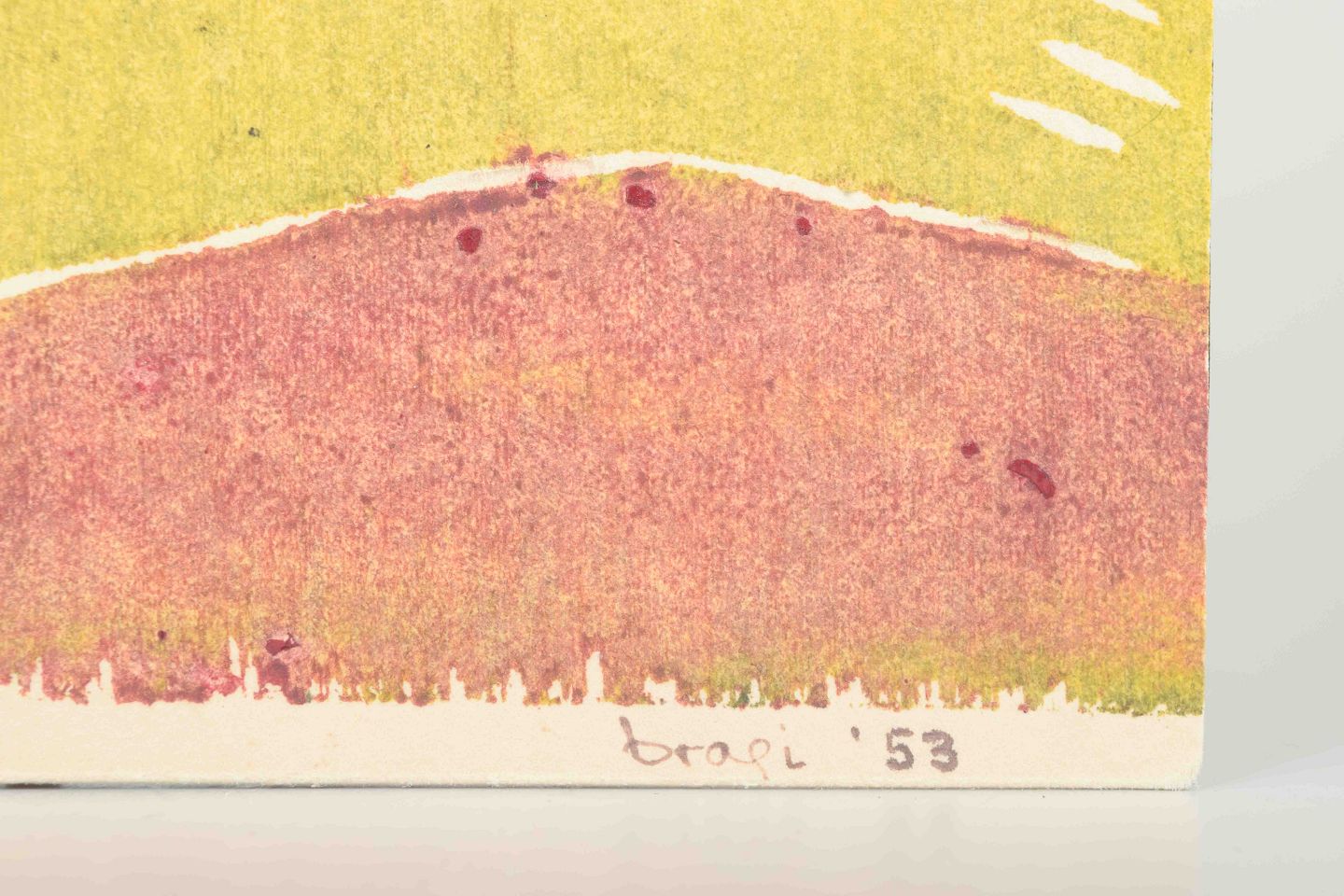 Et ekspressivt og stiliseret aktmotiv udført af Bragi i 1953, hvor den enkle linjeføring og farveflader skaber en poetisk balance mellem figur og rum. Et fint eksempel på islandsk efterkrigstidsgrafik.