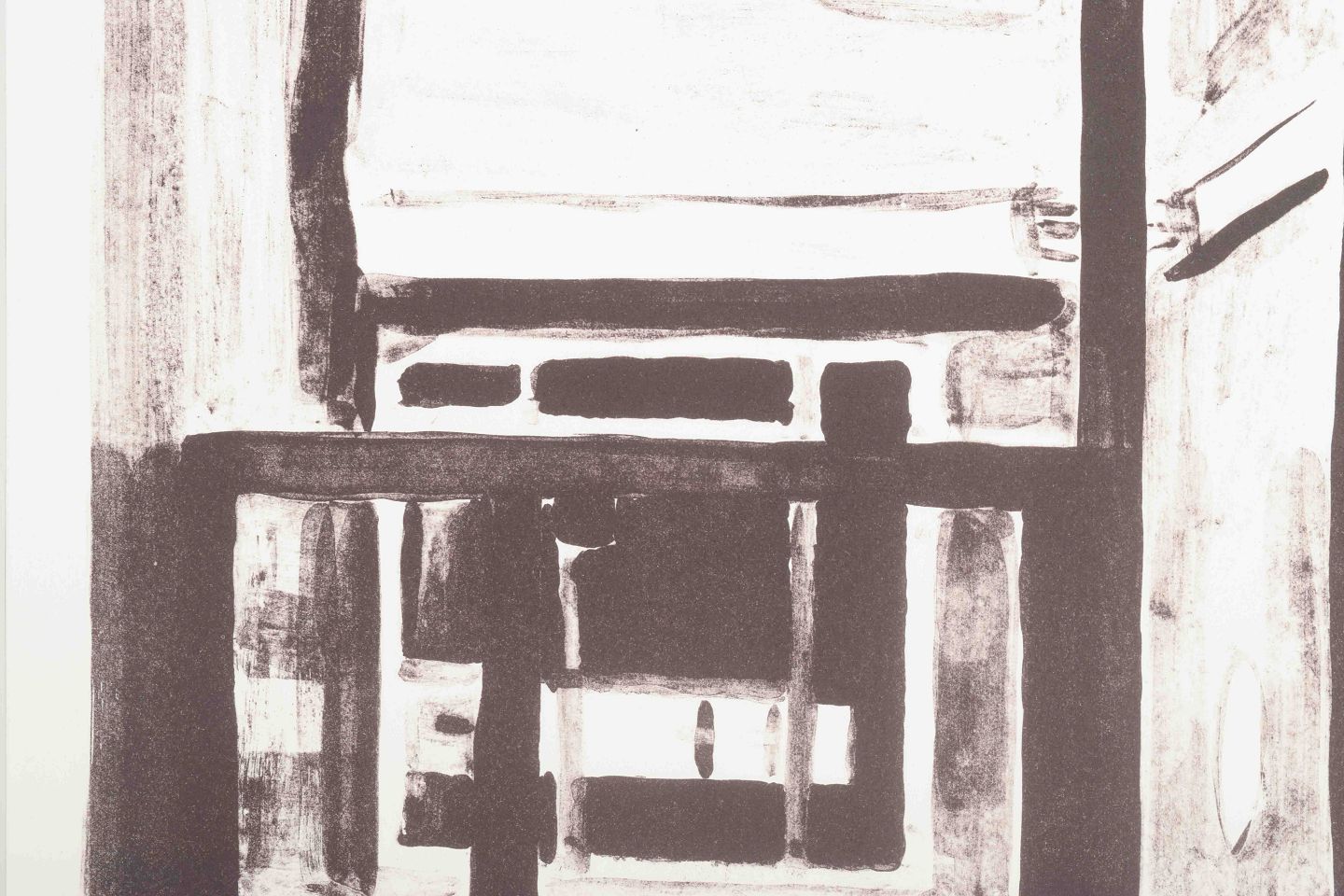 Et grafisk værk af den tyske kunstner Henrik Hold, hvor geometriske og arkitektoniske elementer kombineres i et stærkt sort/hvidt udtryk.
