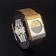 Rectangular wristwatch with a two-tone case in gilt and brushed titanium, minimalist dial in grey and gold, and original integrated bracelet.