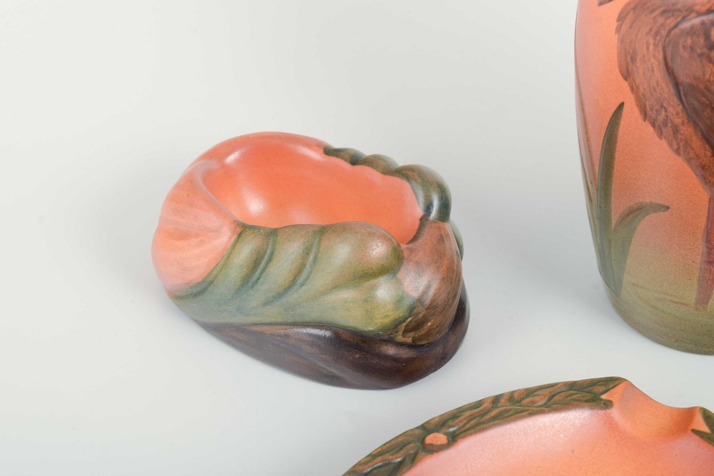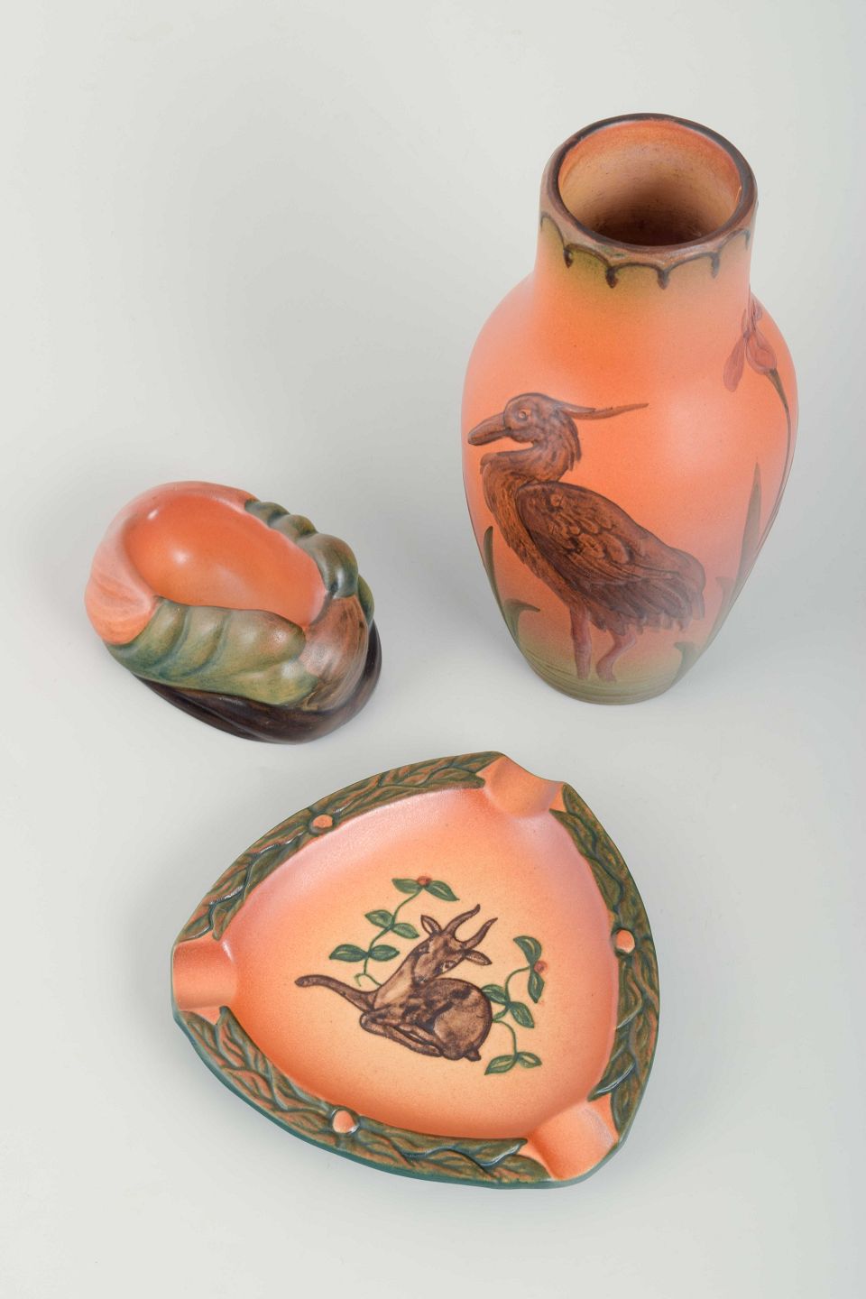 Keramik i orange og grønne nuancer, dekoreret med naturalistiske motiver af fugl, hare og bladform.