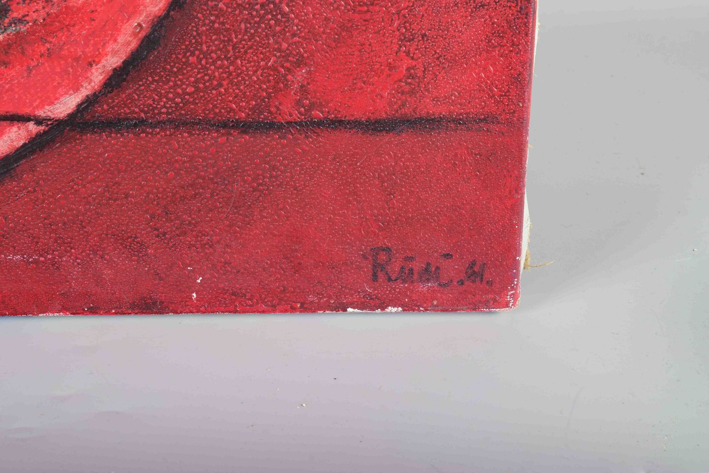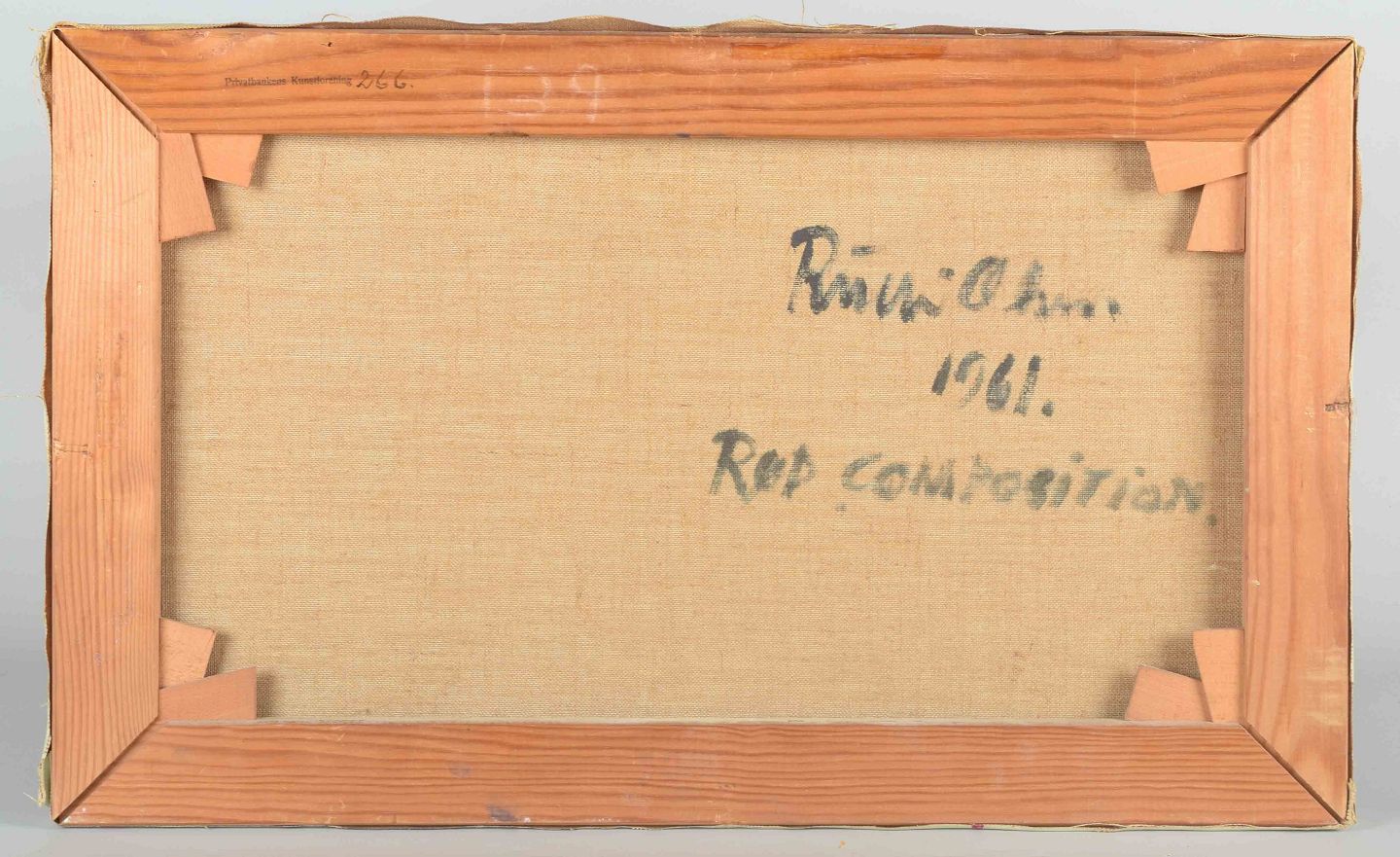 En tidlig abstrakt komposition af den danske maler Rudi Olsen, udført i 1961. Maleriet er holdt i stærke røde toner med geometriske former og kontrastfulde linjer.