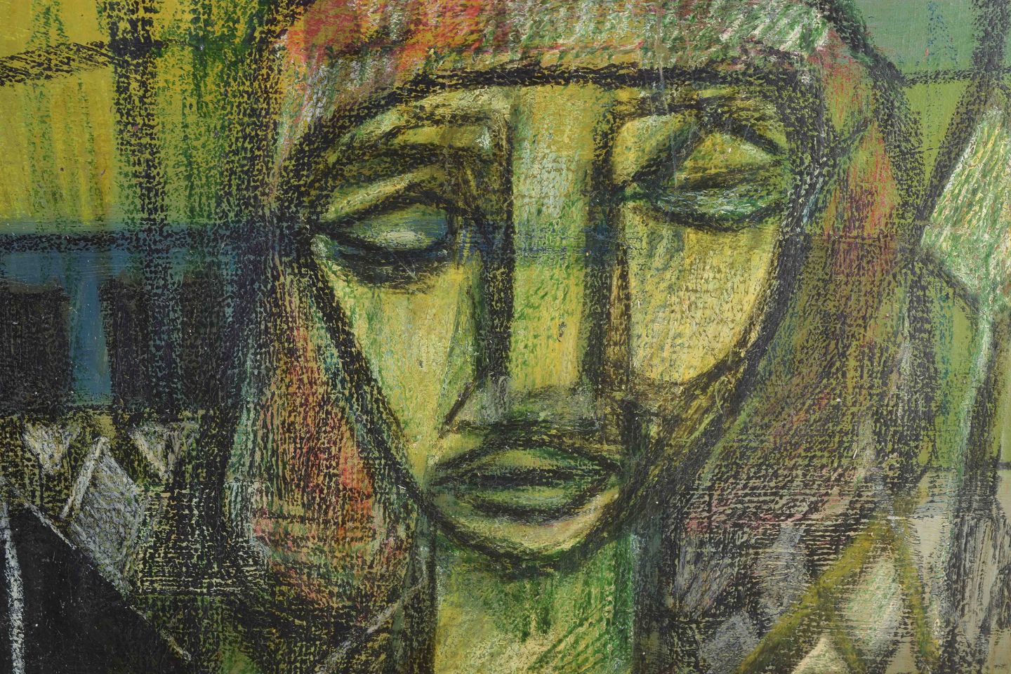 Et ekspressivt maleri med kubistiske og abstrakte træk, hvor en stiliseret menneskefigur optræder i en komposition præget af geometriske felter og dæmpede grønne og jordfarvede nuancer. Værket afspejler en modernistisk søgen efter at forene figur og rum i en rytmisk og fragmenteret struktur.