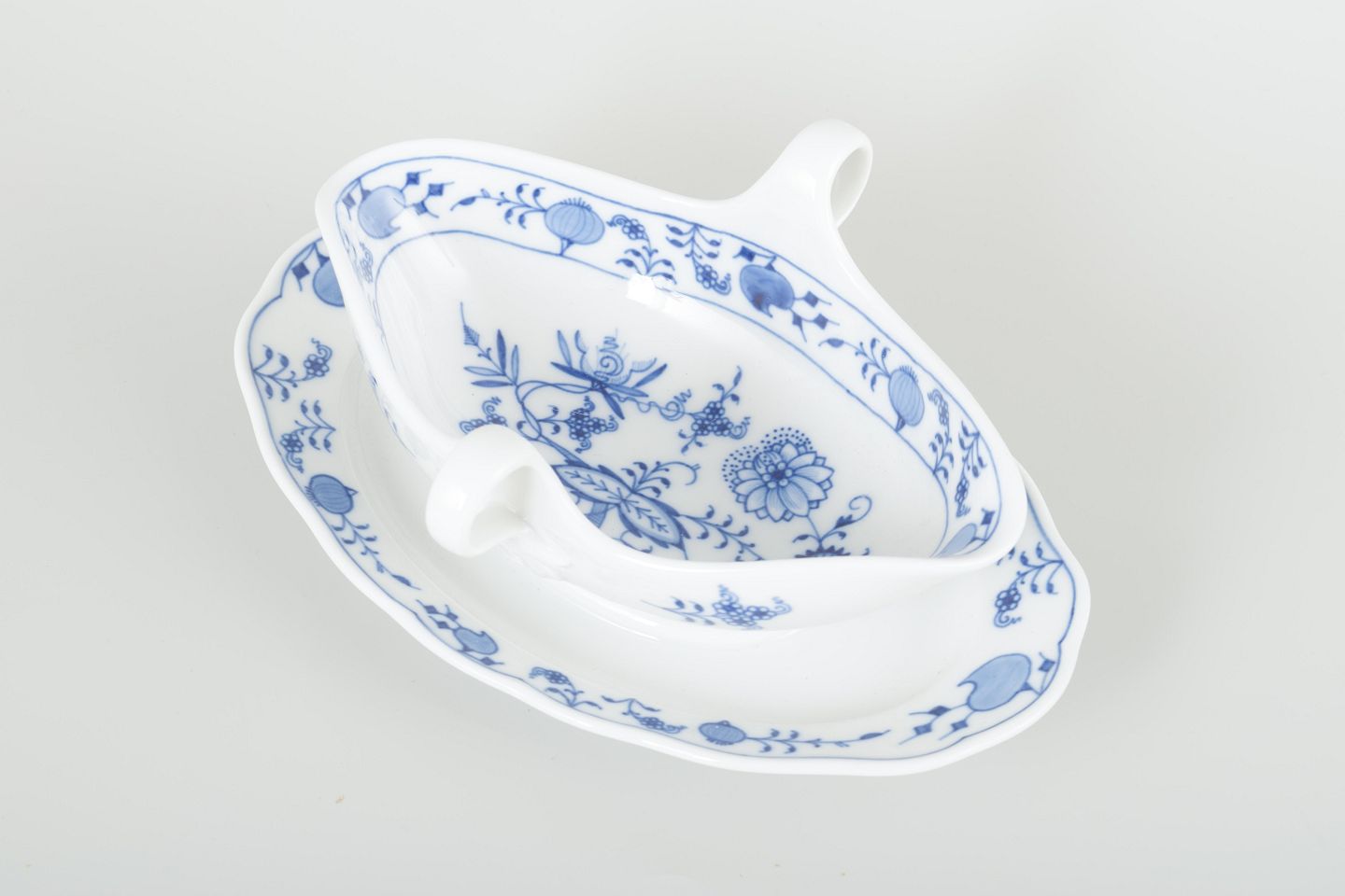 Sauce boat with attached stand, “Blue Onion” pattern, early 20th century.