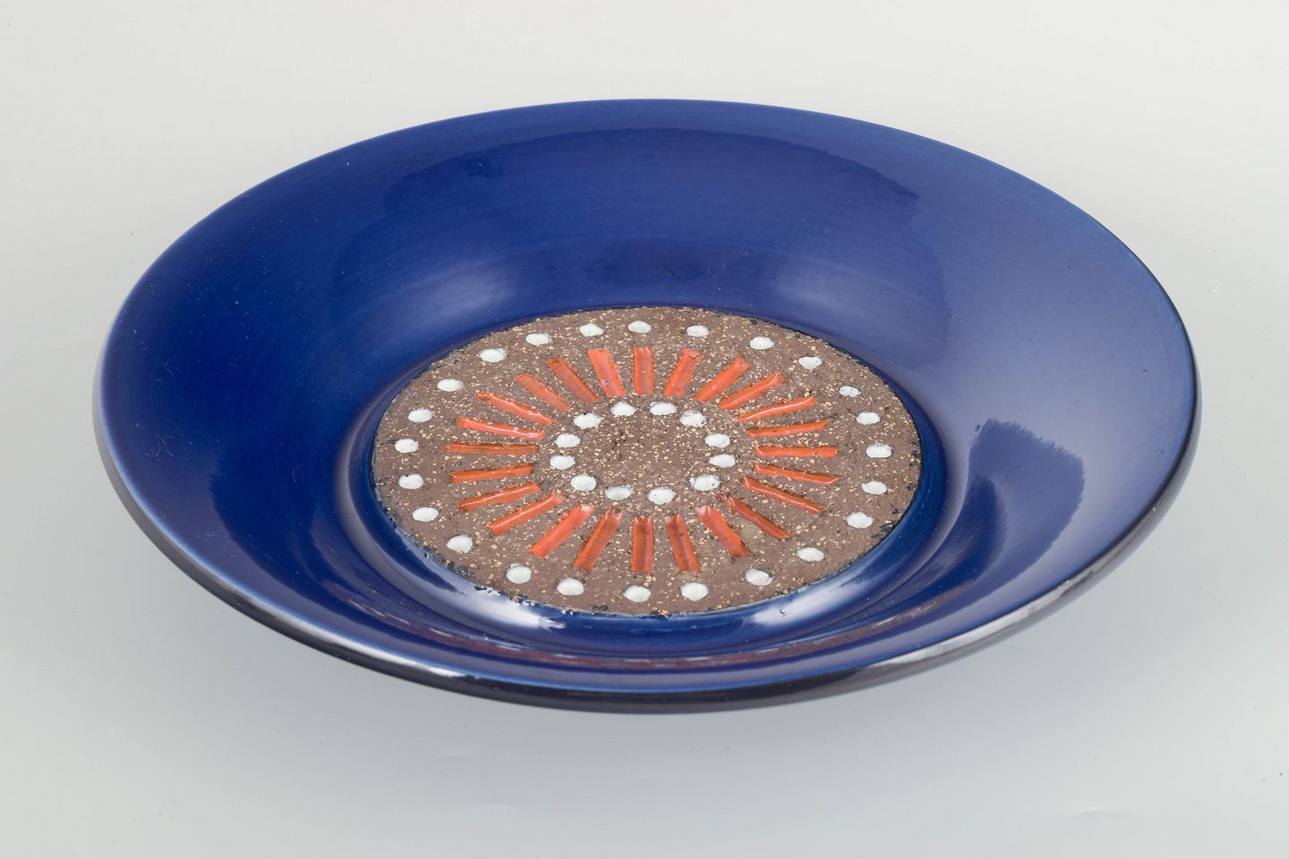 Hånddekoreret keramisk fad med mørk, grov chamottebund og radiært orange reliefmønster, omgivet af hvide prikmotiver — indrammet af en dyb, blank kongeblå glasur.