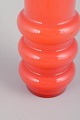 Mundblæst vase i intens orange glas med markant, skulpturel form bestående af cylindrisk krop med tre afrundede bånd. Et karakteristisk design fra 70’ernes svenske glaskunst, hvor form og farve blev brugt som dekorative virkemidler.