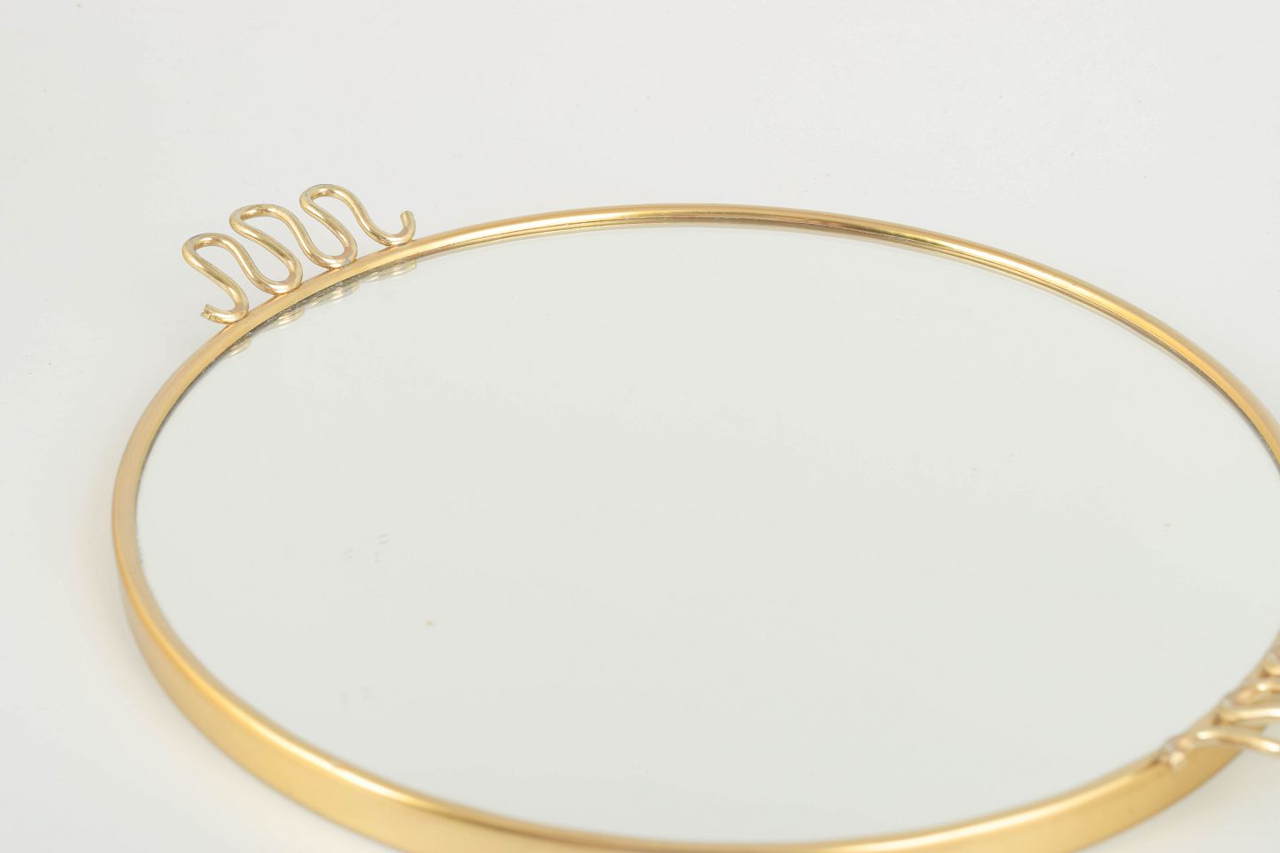 Elegant rund bakke med spejlglas og ramme i poleret messing. De karakteristiske buede håndtag i art deco-inspireret “Swedish Grace”-stil giver et raffineret og klassisk udtryk.