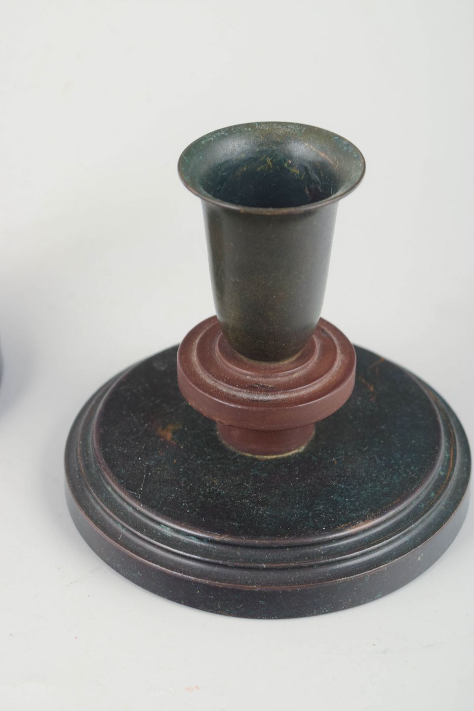 Elegant pair of round art deco candlesticks in patinated bronze with geometric base and cylindrical candle holder. Subtle functionalist design with warm brown-green tones and refined proportions.