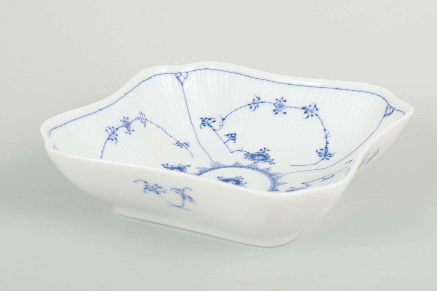 Elegant firkantet skål i musselmalet riflet porcelæn med let bølgede kanter og håndmalet koboltblå dekoration på riflet korpus.