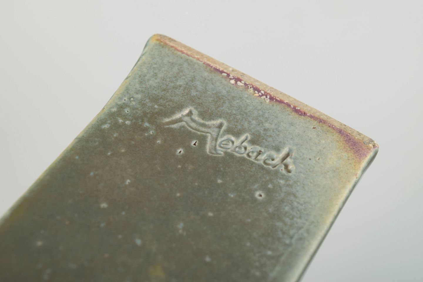 Håndglaseret og signeret vase i karakteristisk asymmetrisk form, udført i stentøj med diskret iriserende overflade og et stramt, moderne udtryk typisk for Mobach-værkstedets 1970’er-produktion.