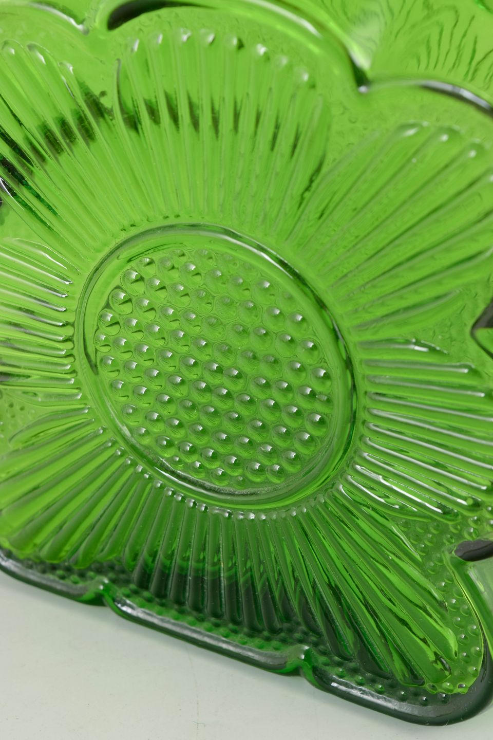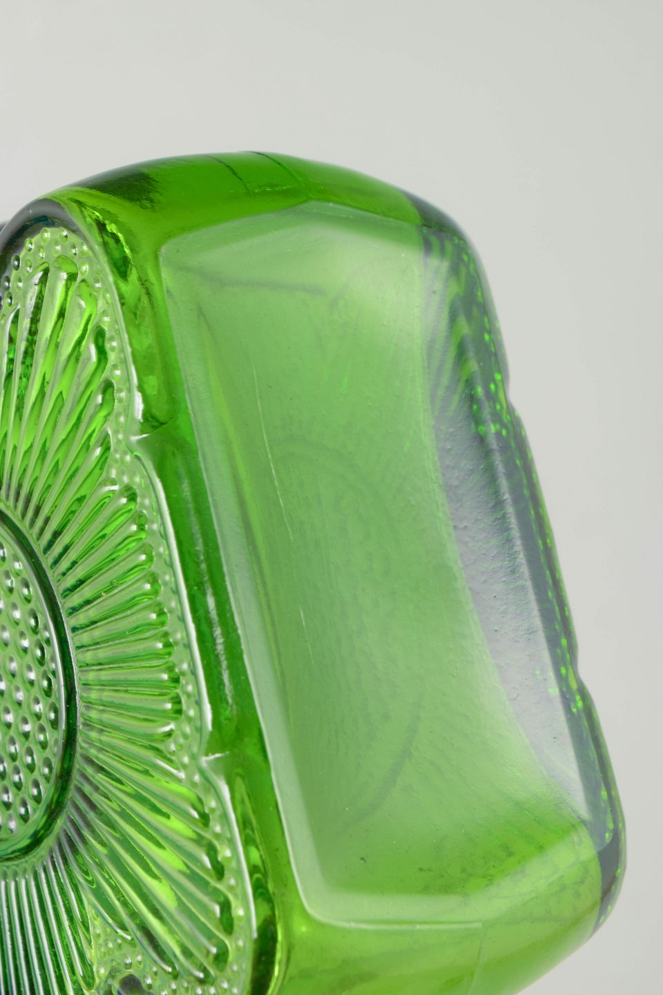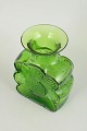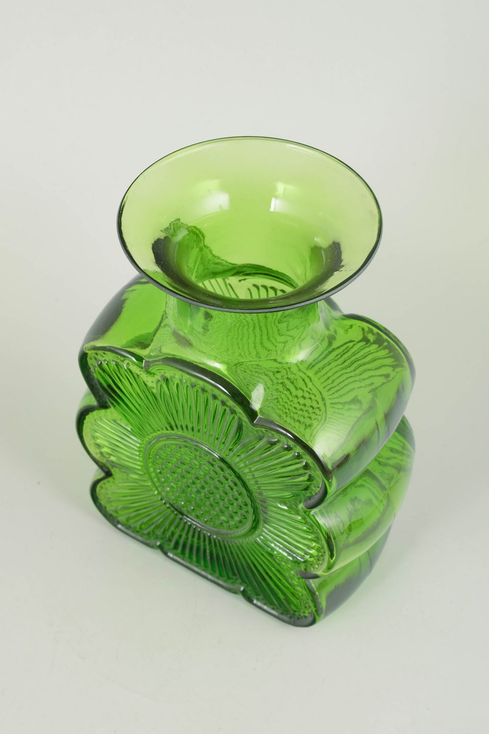 Iconic green glass vase from the Amuletti series, designed by Tamara Aladin for Riihimäen Lasi. The model is distinguished by its bold flower-shaped form and strong sculptural presence, typical of Finnish glass design of the 1970s.