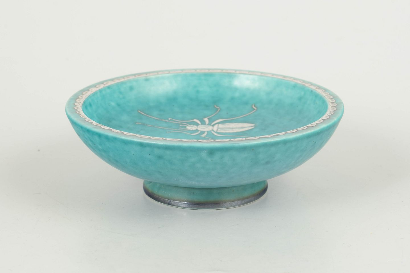 Low, rounded bowl in the iconic turquoise Argenta glaze, decorated with an inlaid silver motif. The piece reflects Kåge’s characteristic balance of functional form and refined decorative detail and stands on a small foot.