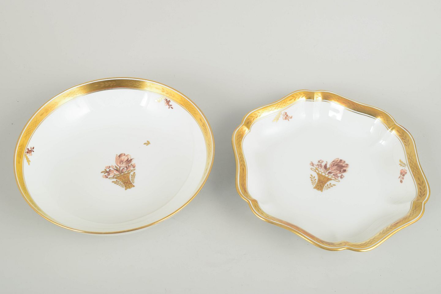 Two elegant porcelain bowls from Royal Copenhagen’s “Golden Basket” series, models 595/9024 and 595/9458. Both feature gilded rims and hand-painted floral basket motifs. One bowl is round, the other has a softly scalloped edge.