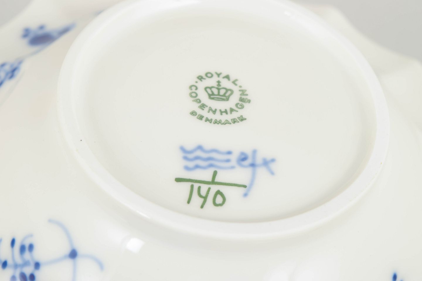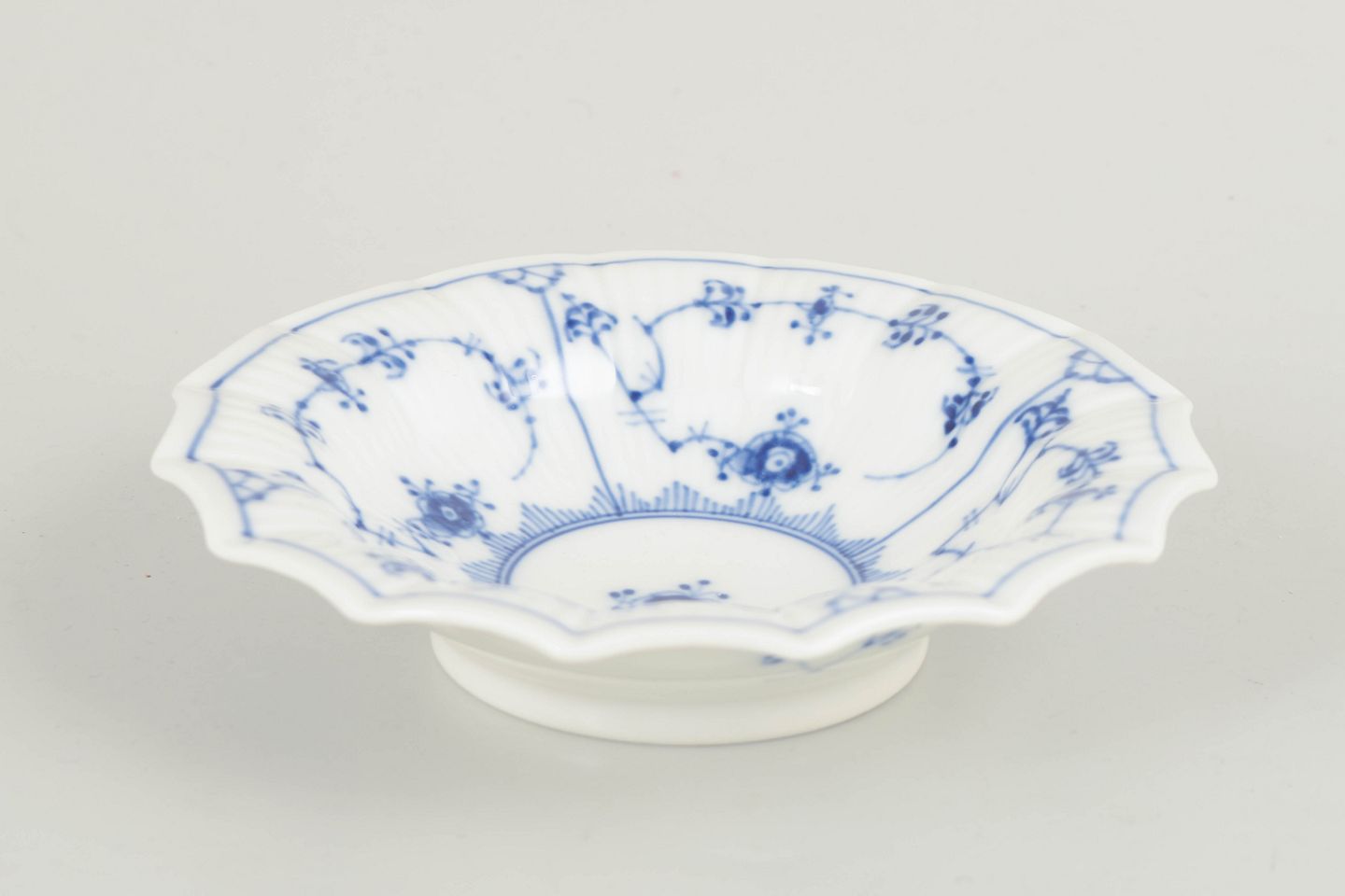 Klassisk asiet i Musselmalet Riflet, udført i riflet form med let bølget kant og dekoreret med håndmalet koboltblå underglasur. Asietten har et centralt spejl omgivet af den karakteristiske musselmalede dekoration og fremstår som en elegant mindre del til servering af kage, dessert eller tilbehør.