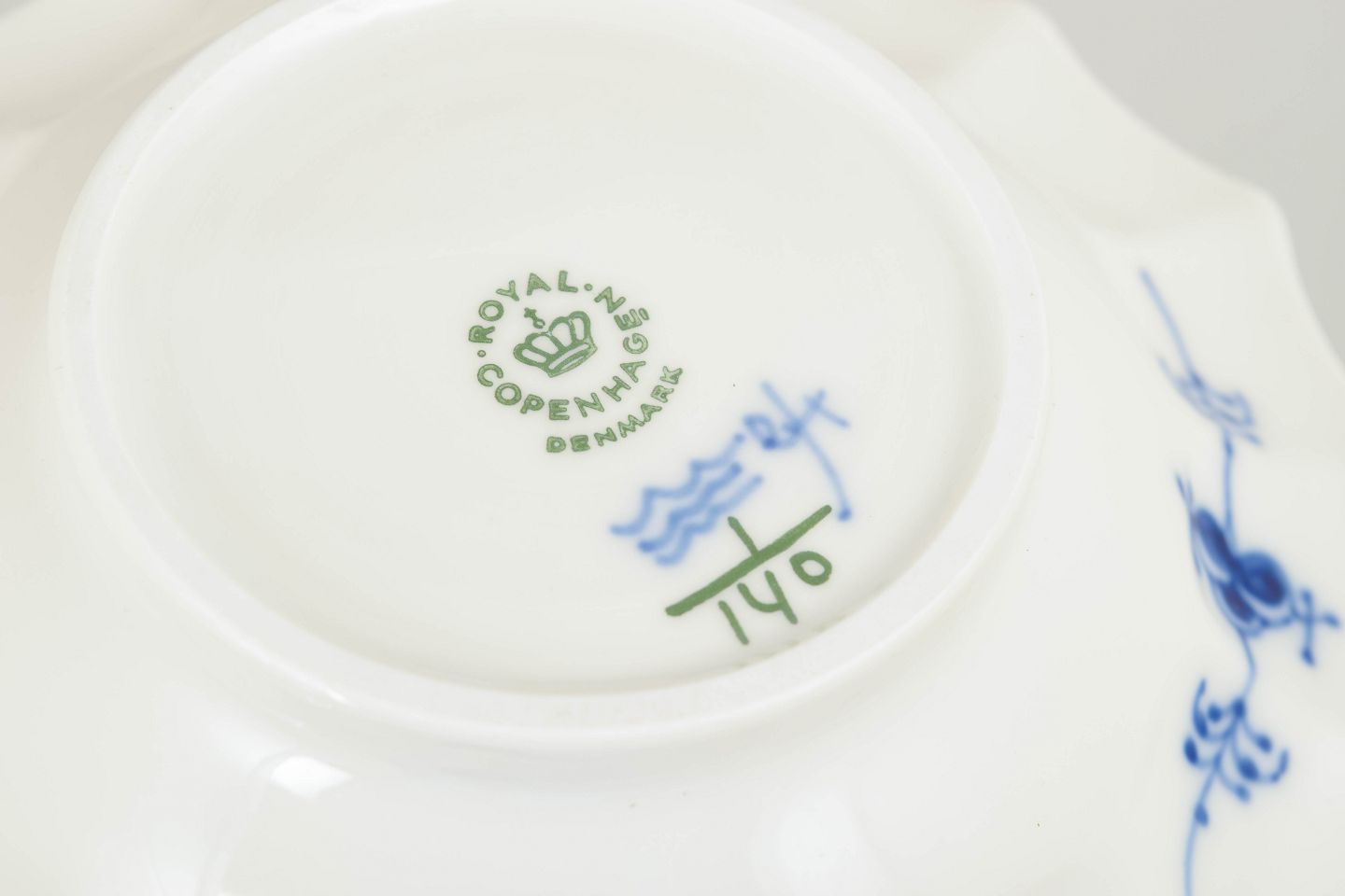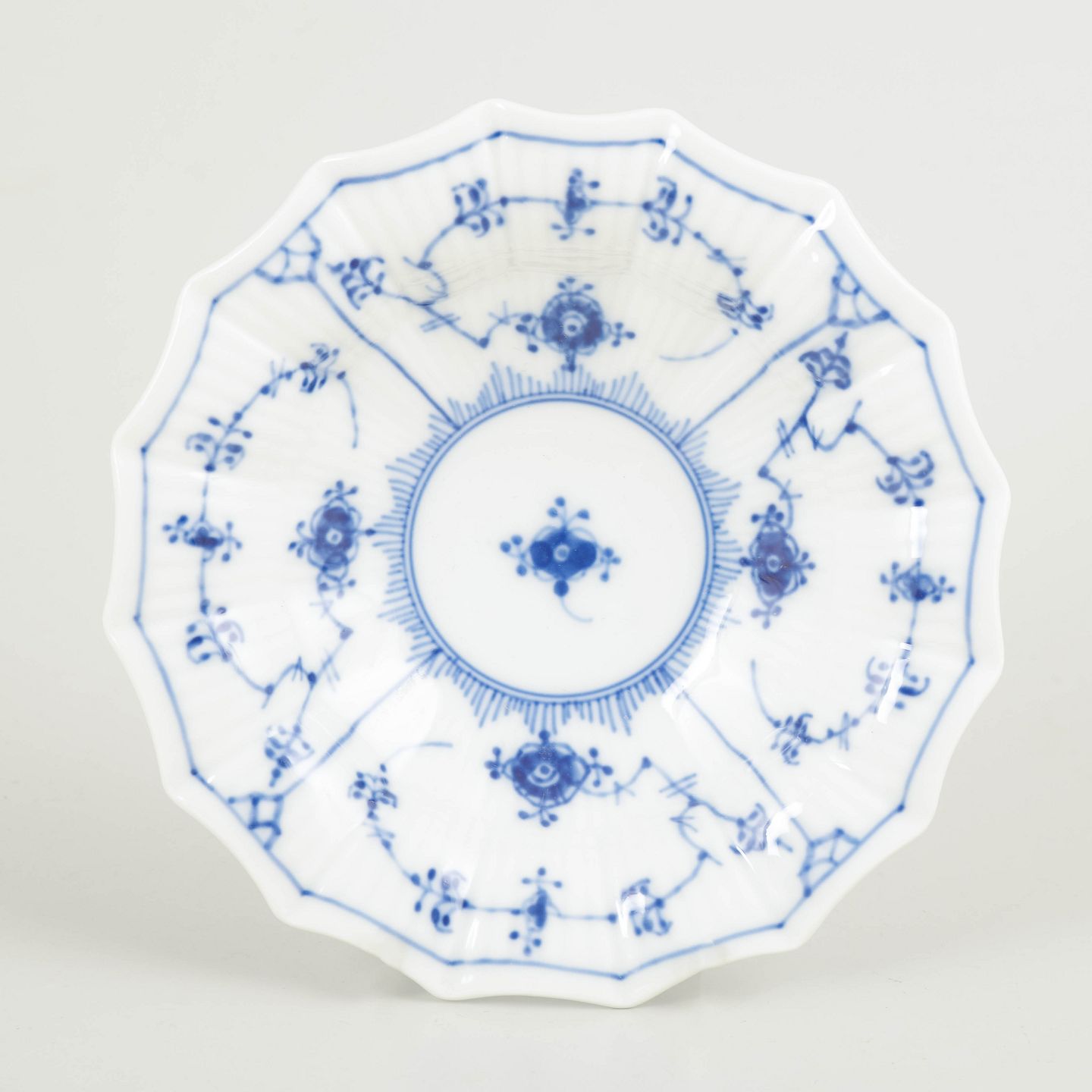 Klassisk asiet i Musselmalet Riflet, udført i riflet form med let bølget kant og dekoreret med håndmalet koboltblå underglasur. Asietten har et centralt spejl omgivet af den karakteristiske musselmalede dekoration og fremstår som en elegant mindre del til servering af kage, dessert eller tilbehør.