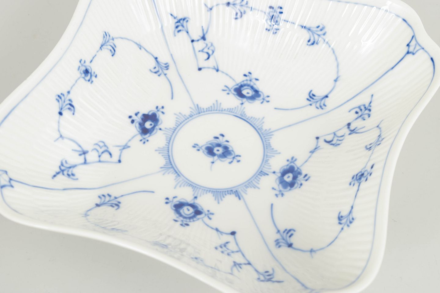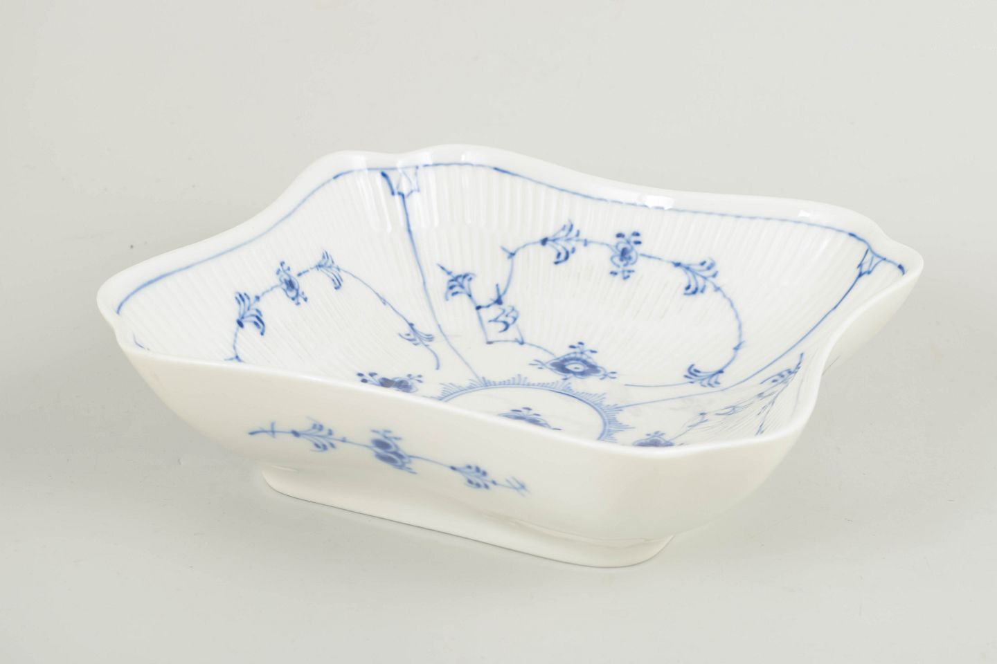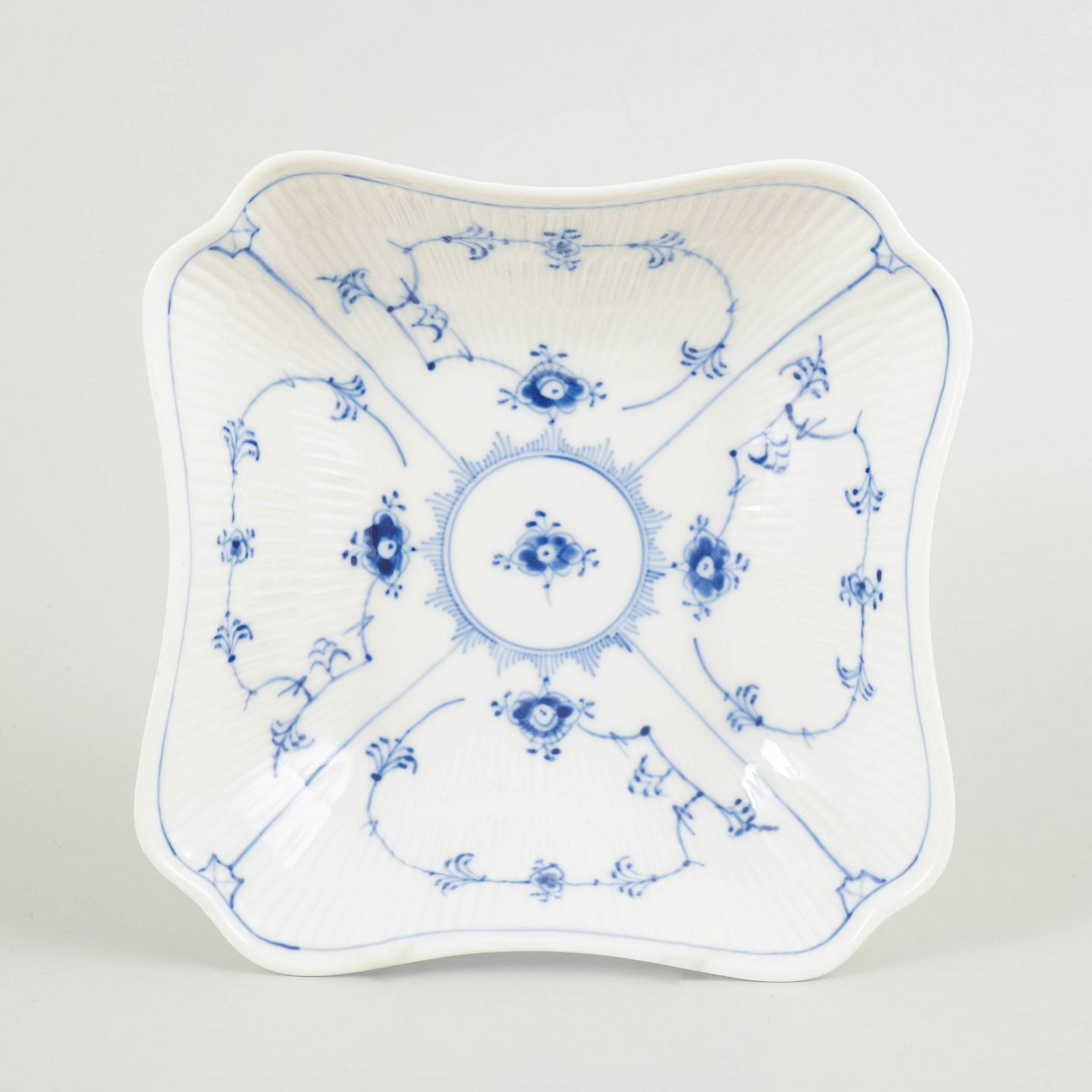 Distinctive square bowl in Blue Fluted Plain, made in the classic fluted form with gently undulating edges and decorated with hand-painted cobalt blue underglaze. The bowl is divided into four sections around a central well and represents a sculptural and relatively uncommon serving piece within the service.