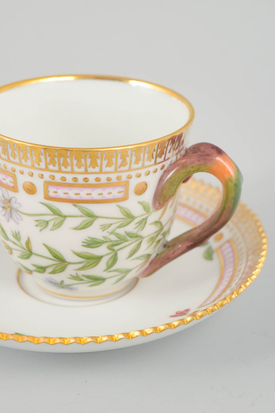 Elegant moccakop med tilhørende underkop i det ikoniske Flora Danica-stel. Koppen er håndmalet med botanisk motiv gengivet efter Flora Danica-værket og udført i stellets karakteristiske, raffinerede formsprog med dekorativ kant. En klassisk og eksklusiv kaffekop.