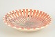 Dekorativ skål i fajance med karakteristisk slynget slipdekoration i rosa, creme og mørke kontrasttoner. Den brede, lavtbuede form fremhæver den dynamiske, spiralformede dekoration, som er typisk for Kählers kunstneriske produktion i mellemkrigstiden. Et fint eksempel på dansk keramikkunst fra 1930’erne.