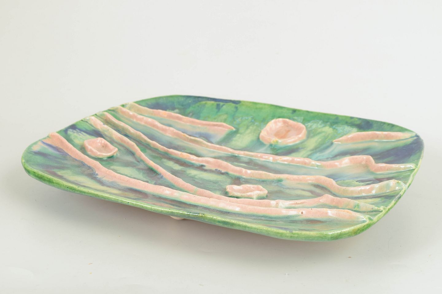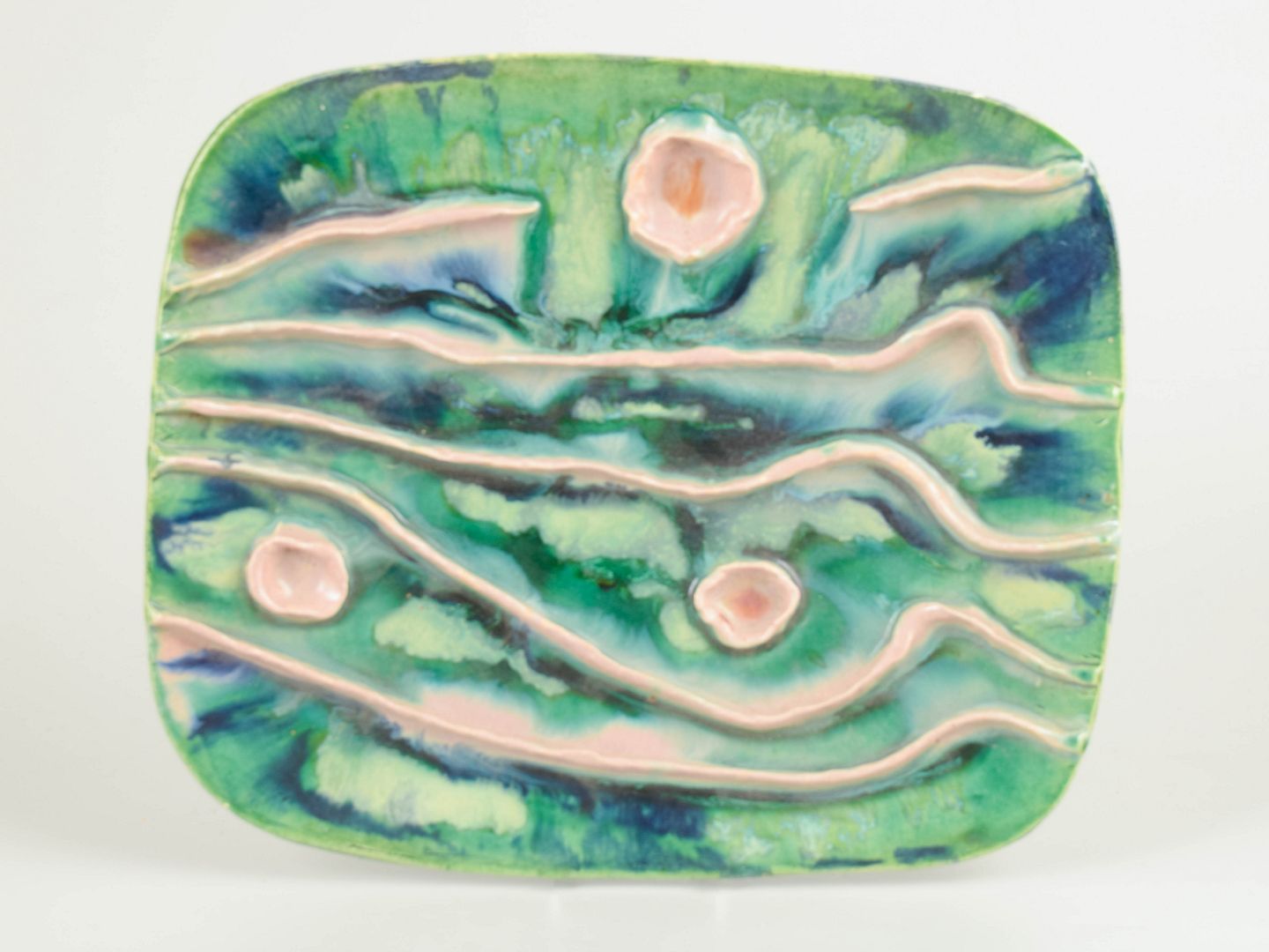 Unique wall-mounted ceramic relief executed in organic forms with pronounced sculptural depth. The surface is richly modelled with flowing lines and raised elements, decorated with vivid green and blue glazes, contrasted by soft pink relief details. An expressive and tactile work that clearly reflects the experimental ceramic language of the 1970s.