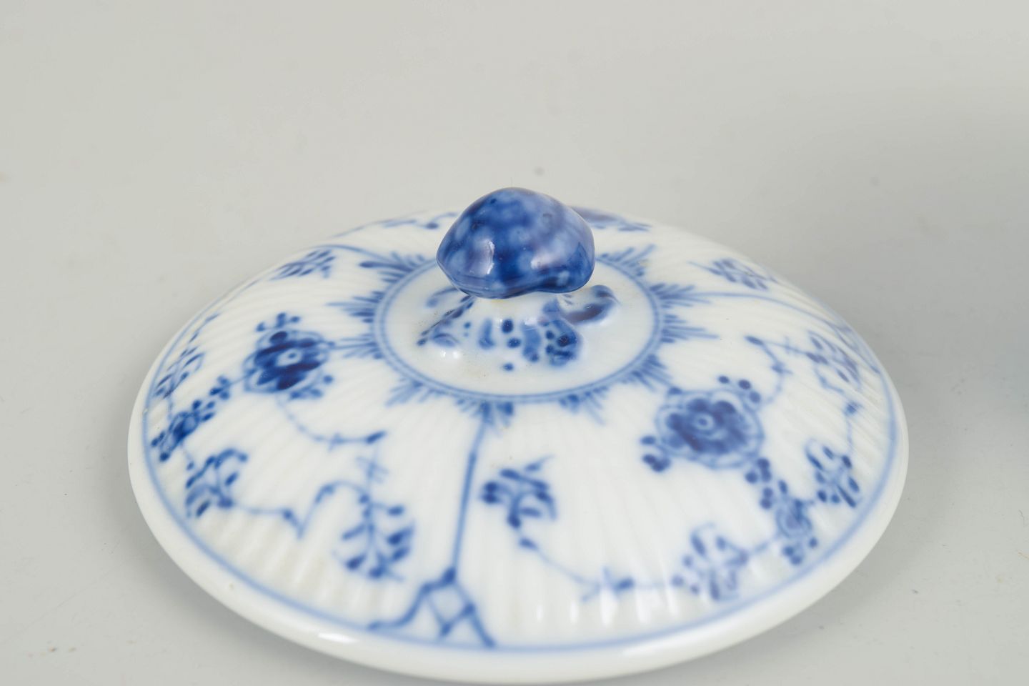 Fluted sugar bowl in glazed porcelain with hand-painted cobalt-blue underglaze decoration. Classic rounded form with matching lid topped by a finial. Model 1/239.