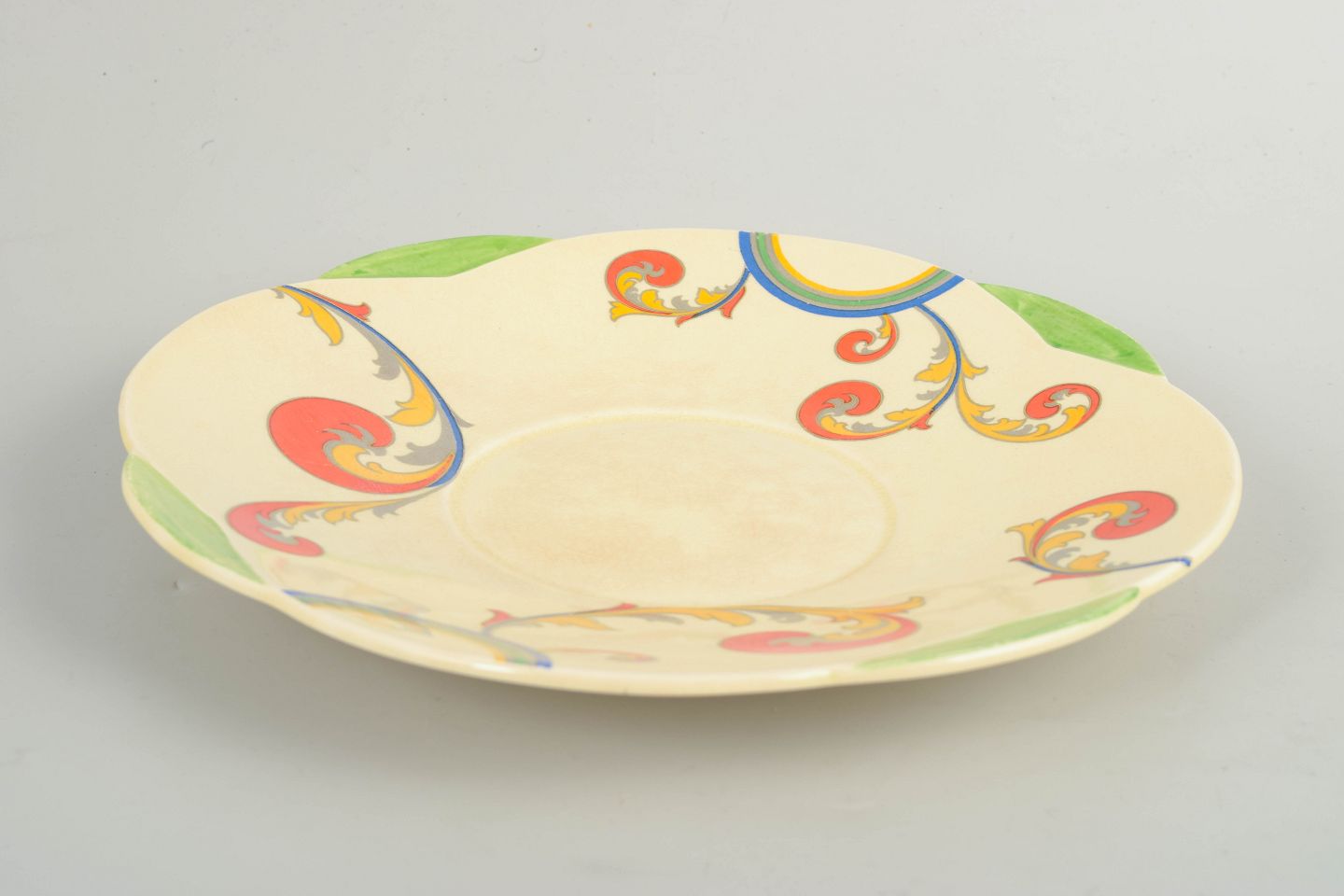 Art Deco faience serving dish with a craquelure glaze and hand-painted decoration from the “Syren” series. The dish features a round form with a softly scalloped rim and a dynamic, stylised floral motif in vivid, contrasting colours, characteristic of Clarice Cliff’s interwar design language.