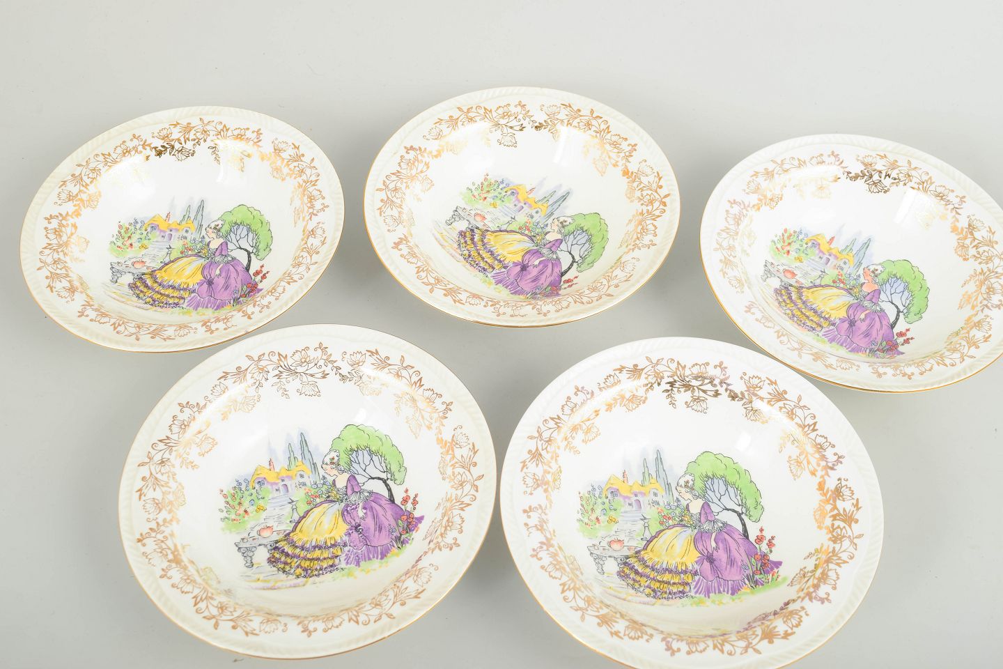 Sæt med fem fajanceskåle med trykt dekoration i pastelfarver med figurmotiv i midten samt rigt udformet, gylden bladranke-bort langs kanten.