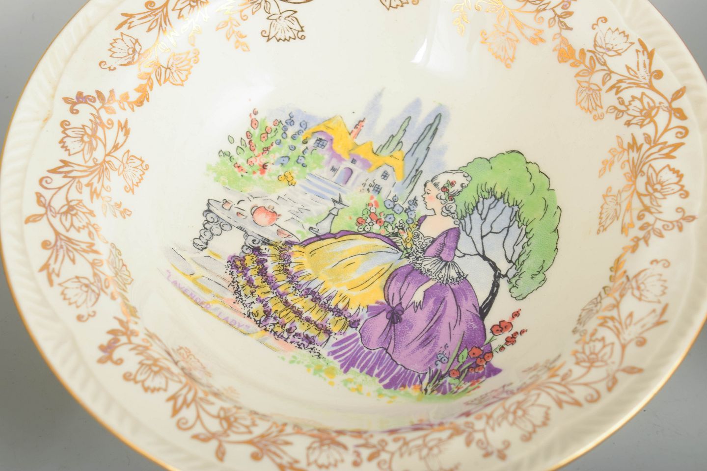 Engelsk fajance fra mellemkrigstiden blev ofte produceret som dekorativt og prisvenligt bordtøj, hvor trykte motiver og ornamenterede borter gav et elegant udtryk. I 1930’erne var romantiske figurscener og gyldne detaljer populære elementer, der skulle tilføre hverdagsservicer et mere festligt præg.