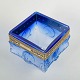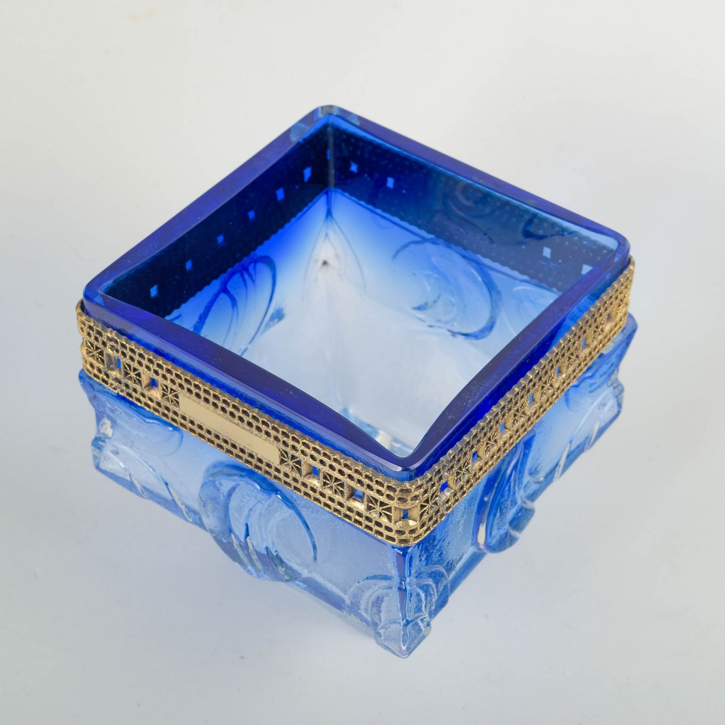 Kraftig glasskål i blåtonet formstøbt glas med geometrisk relief og påsat metalmontering langs kanten. Skålen er håndsigneret og fremstår som et markant eksempel på finsk design fra perioden.