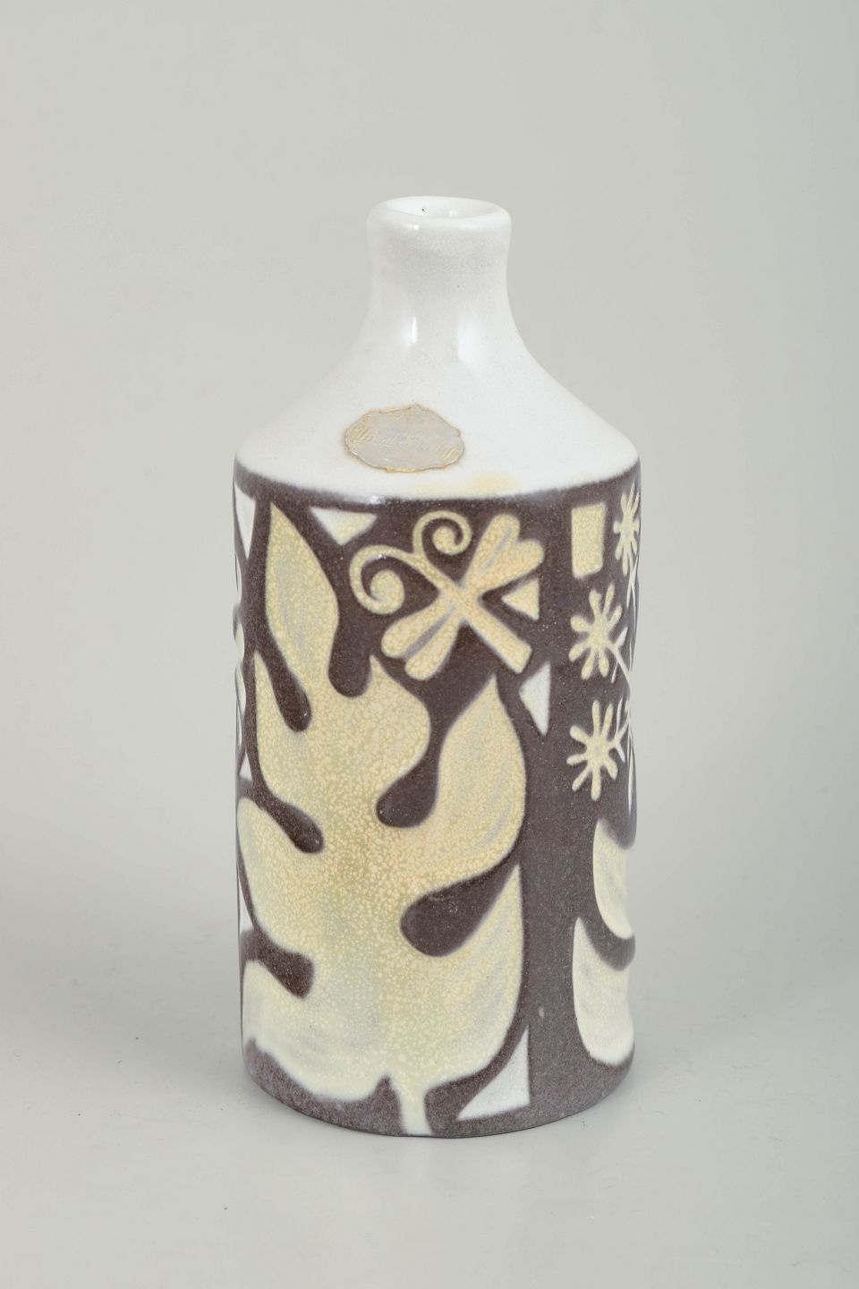 Cylinderformet vase i glaseret keramik med smal hals og grafisk dekoration i creme- og brunlige toner mod hvid bundglasur. Dekoren består af stiliserede bladmønstre og ornamentale elementer i et tydeligt modernistisk formsprog. Modelnummer 4330/683.
