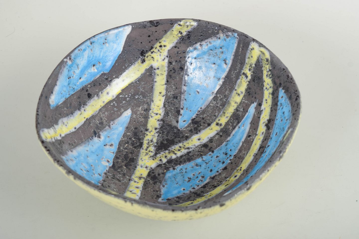 Skål i glaseret keramik med rund, let konisk form og hånddekoreret inderside i abstrakt mønster med blå, gule og mørke felter. Ydersiden er dækket af en gul glasur med karakteristisk sprøjtet overflade, typisk for Gambones arbejde i perioden.
