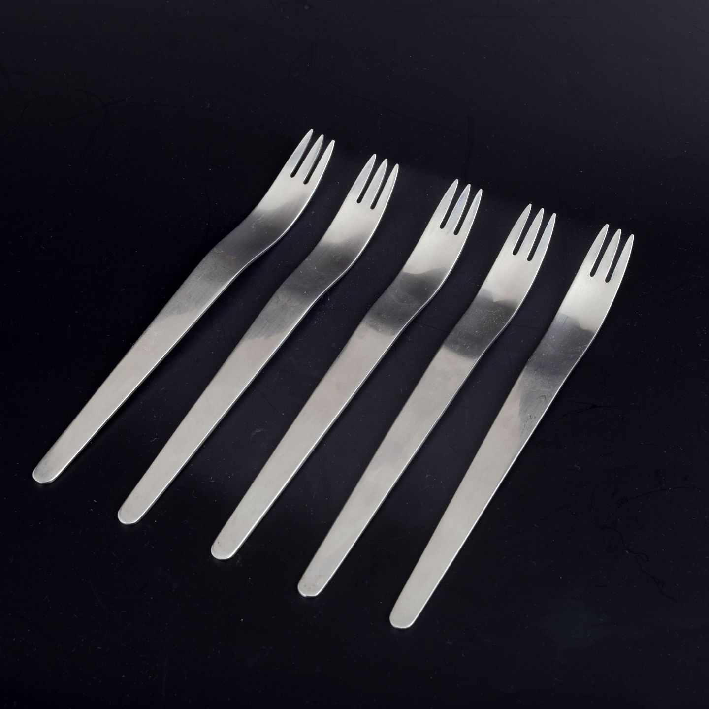 Fem middagsgafler i rustfrit stål.