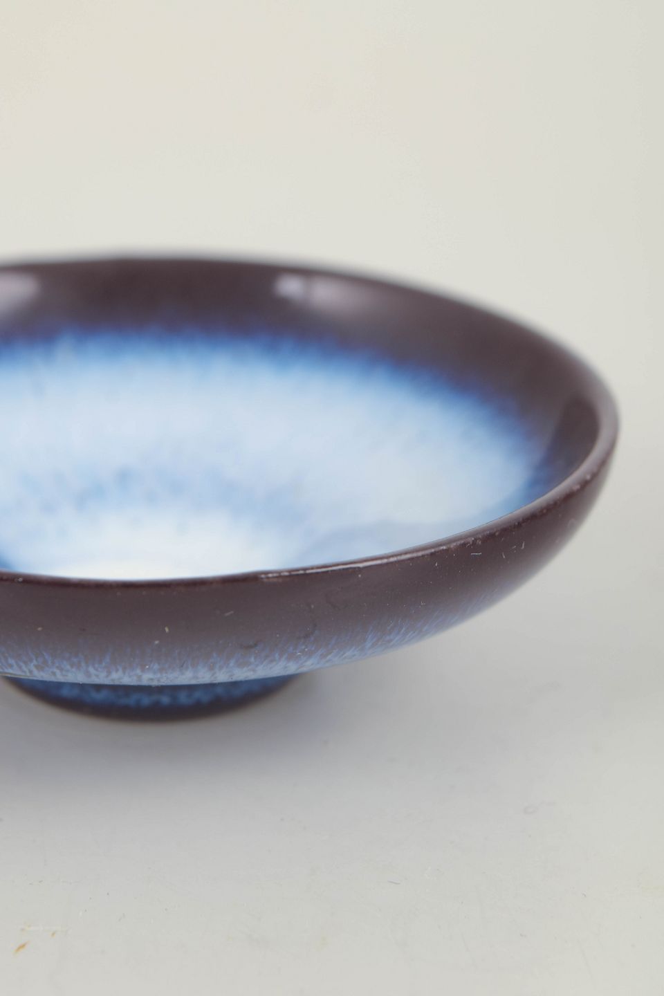 Small shallow bowl in glazed stoneware with a softly rounded profile. Finished with a dark outer rim and a luminous blue interior glaze, reflecting Gunnar Nylund’s refined approach to colour and surface in reduced-scale works. The compact proportions emphasise the miniature nature of the piece.