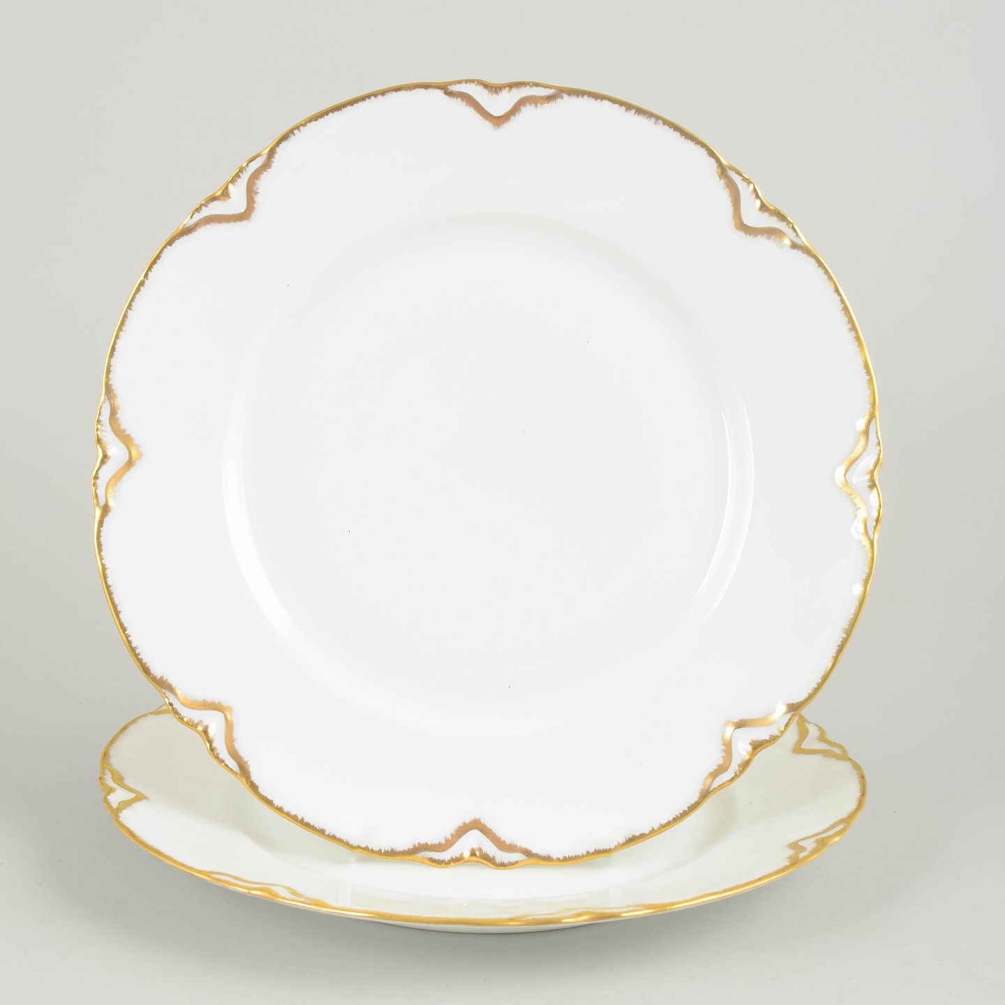 Two French white faience dinner plates with a scalloped rim, gilt edge and stylised Art Deco-inspired gold detailing around the border.