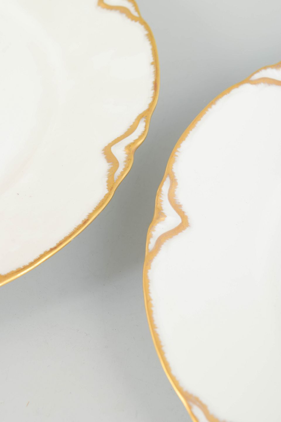 Limoges was a major centre for French tableware in the first half of the 20th century, and the 1930s aesthetic was often shaped by Art Deco with elegant contours and crisply stylised ornament. Gilded rims and softly modelled, scalloped borders lent services a refined, decorative finish suitable for both everyday use and formal settings.