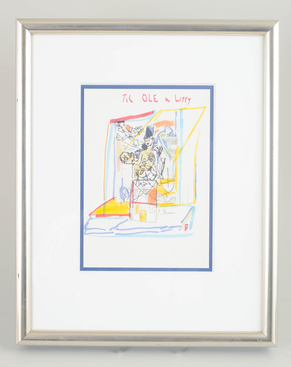 Abstrakt og figurativt sammensat motiv med ekspressive linjer og farvefelter, udført i blandteknik på papir. Kompositionen kombinerer skitseprægede figurer med geometriske former og transparente farvelag. Signeret.