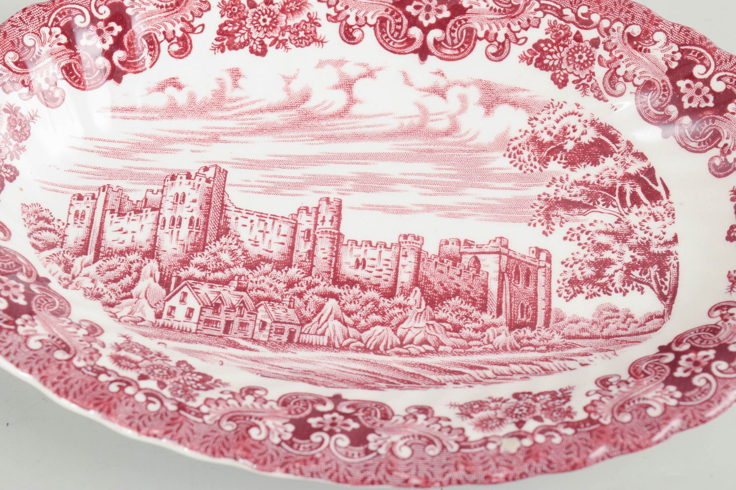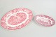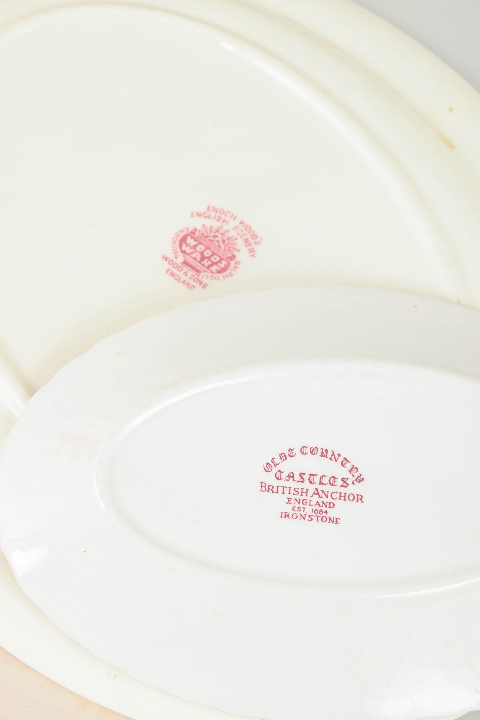 Faience serving trays by Olde Country and Wood & Sons, decorated in red transferware with landscape and architectural motifs and ornamental borders.