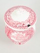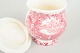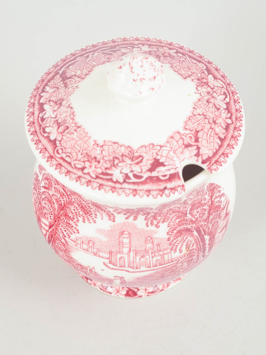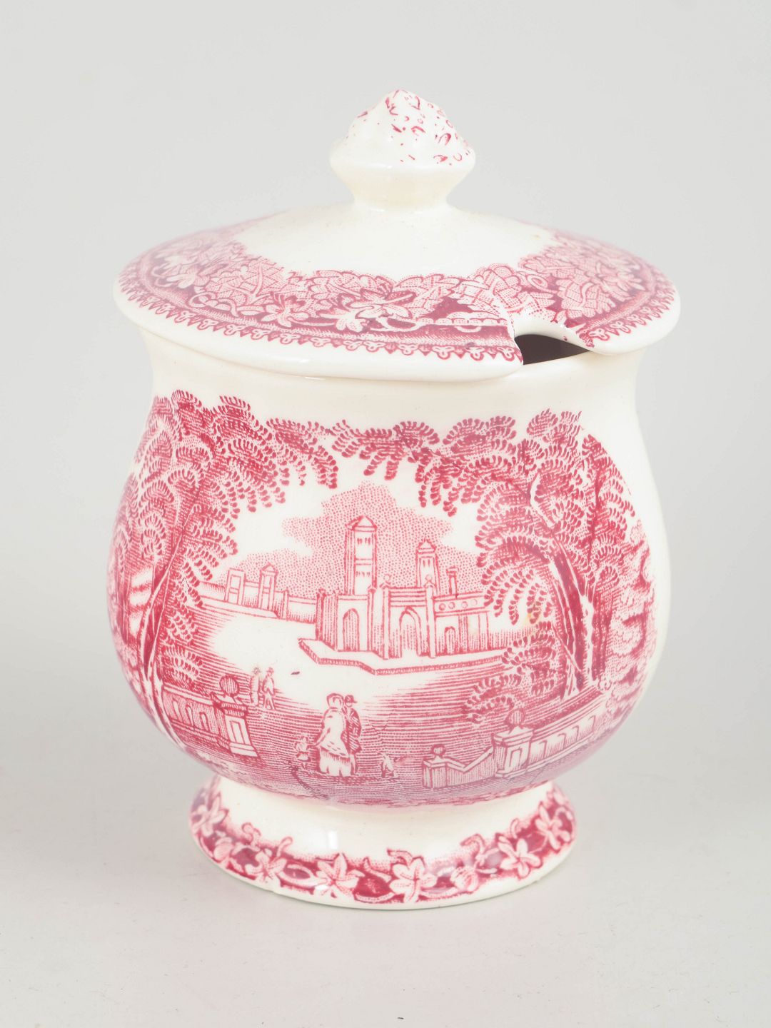 Sennepskrukke i fajance fra Mason’s, dekoreret i rød transferware med arkitektonisk landskabsmotiv og ornamental bort.