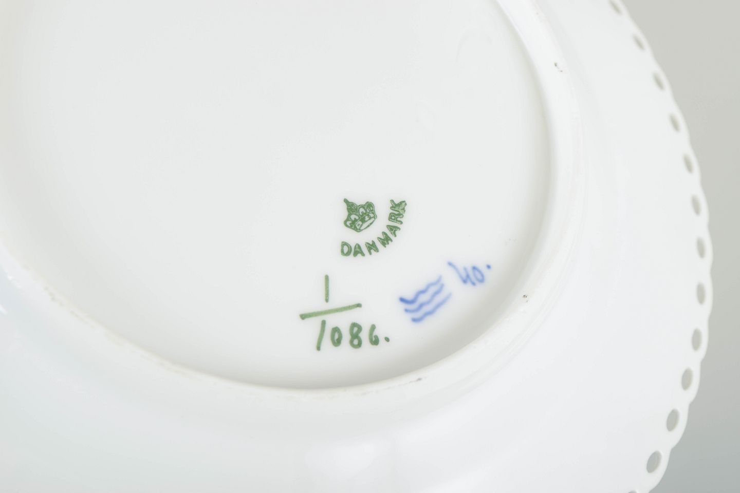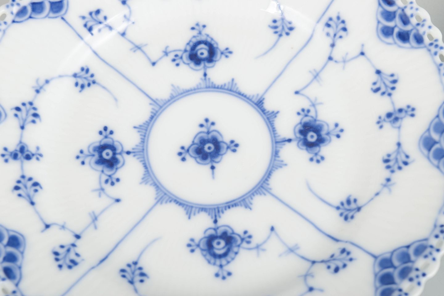 Sæt af to frokosttallerkener i håndmalet porcelæn fra Musselmalet Helblonde med klassisk underglasurdekoration i koboltblå og gennembrudt blondekant. Model 1/1086. Første sortering. Den ene fremstillet i 1920’erne, den anden i 1890’erne.