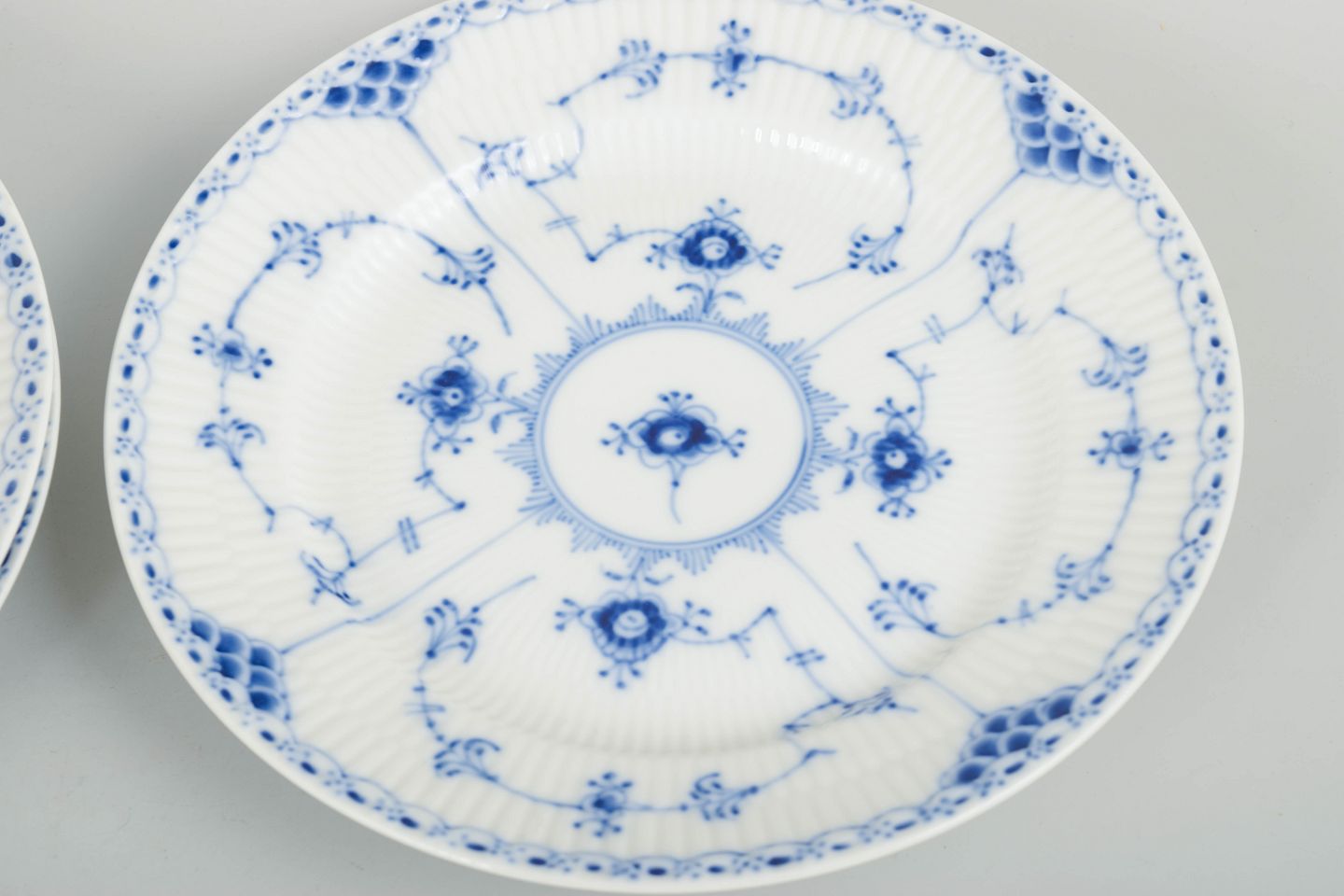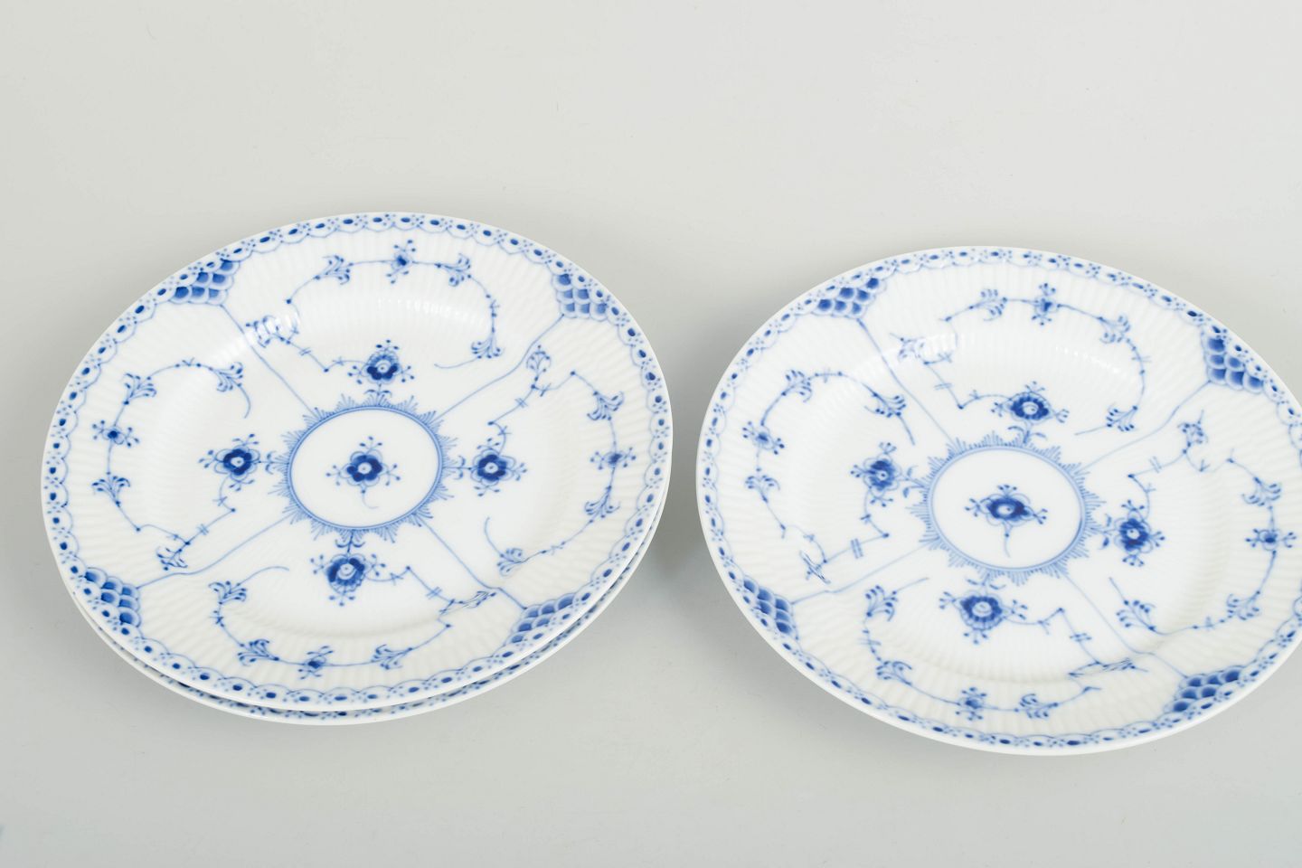 Sæt af tre frokosttallerkener i håndmalet porcelæn fra Musselmalet Halvblonde med klassisk underglasurdekoration i koboltblå, riflede felter og karakteristisk blondekant. Model 1/573. Første sortering.